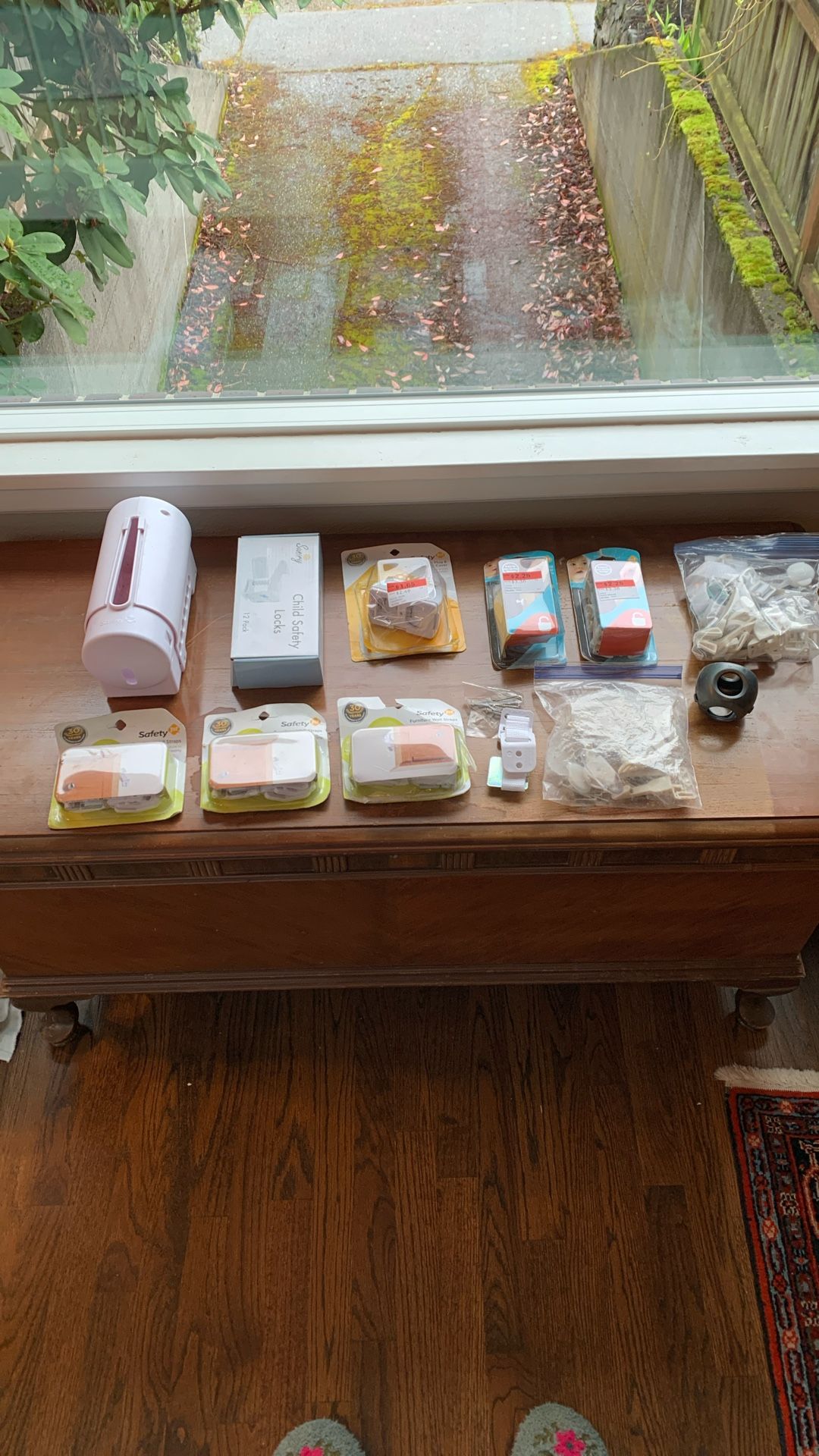 Assortment, including many unopened items —5 furniture safety straps and hardware - lots of cabinet and drawer locks (approx 30) -power strip cover - double plug and outlet cover - single outlet covers (aprox 10) - door knob/stove knob cover -