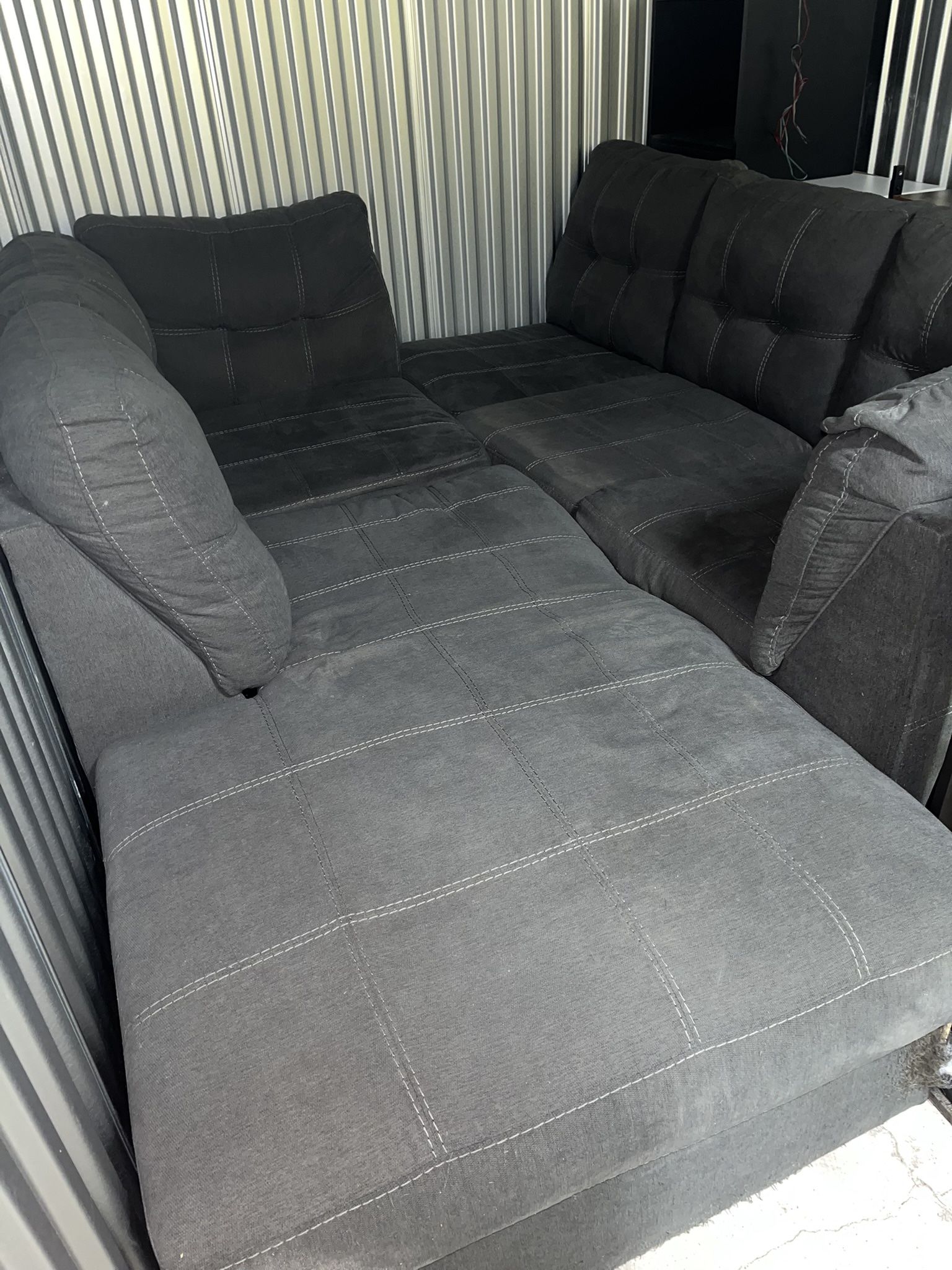 Dark grey sectional. Few years old, light wear & tear. One corner is exposed since my (now deceased) cat thought it would be funny. Bought for ~$1500, selling for $650 OBO. Currently collecting dust in storage.