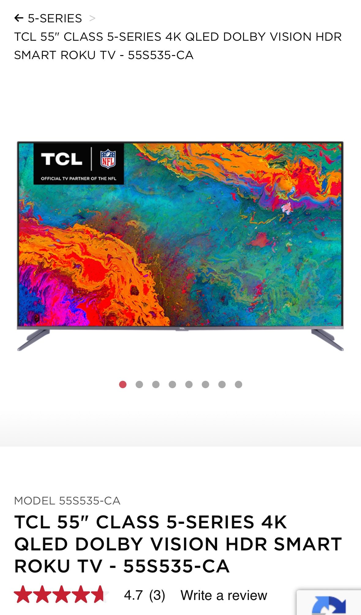MODEL 55S535-CA TCL 55" CLASS 5-SERIES 4K QLED DOLBY VISION HDR SMART ROKU TV - 55S535-CA Superior 4K HDR picture quality Wide Color powered by QLED technology HDR Pro Pack featuring Dolby Vision Contrast Control Zone technology maximizes contrast Stream free TV, live news, sports, movies, and more AiPQ Engine with Smart HDR, Smart 4K Upscaling and Smart Contrast Auto Game Mode for an optimized fast-response gaming experience Simple, personalized home screen Share videos, photos, and music from your Apple device using AirPlay Easy Voice Control works with Siri, Alexa, and Hey Google Advanced Digital TV Tuner with Live TV Channel Guide FullView edge-to-edge glass design Integrated cable management makes your TV setup clean and clutter-free Easy-to-use remote with shortcuts to popular channels Dual-band WiFi & Ethernet port 4 HDMI ports (1 eARC)