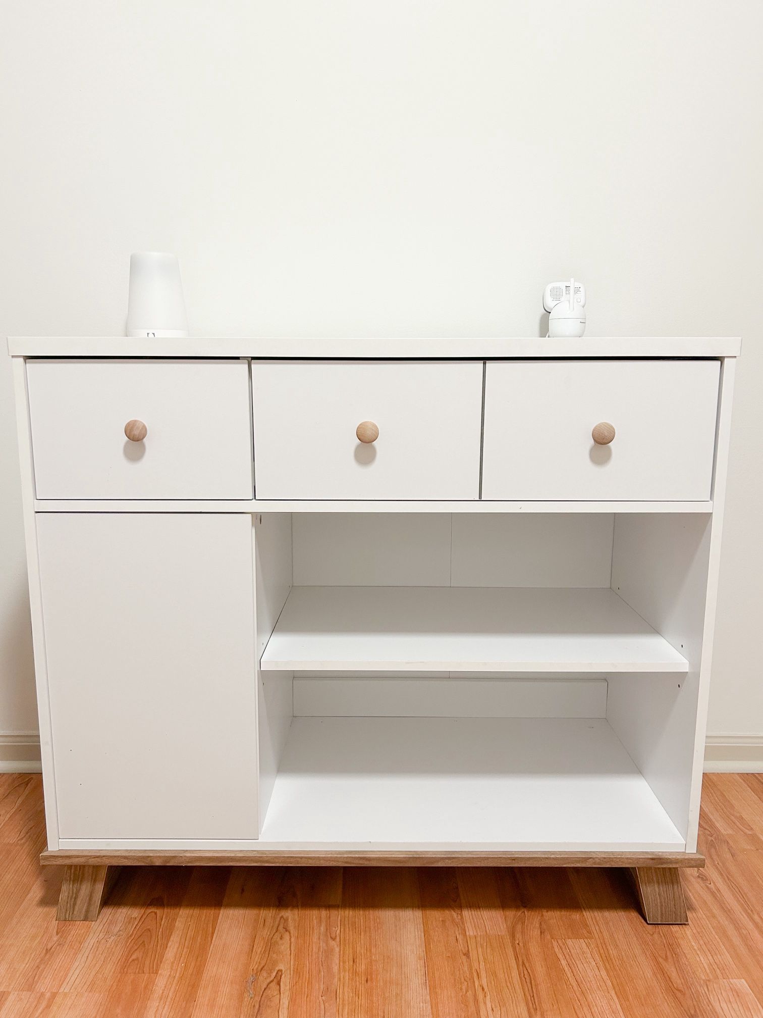 Used but in great condition! Has 2 drawers, 2 open shelves, and a cabinet with extra storage inside. Changing topper fits a standard pad (not included). Small baby lotion stain on top—shown in pics. Currently $228 on Amazon—grab it for less! Pickup in Coral Springs. Smoke-free home.