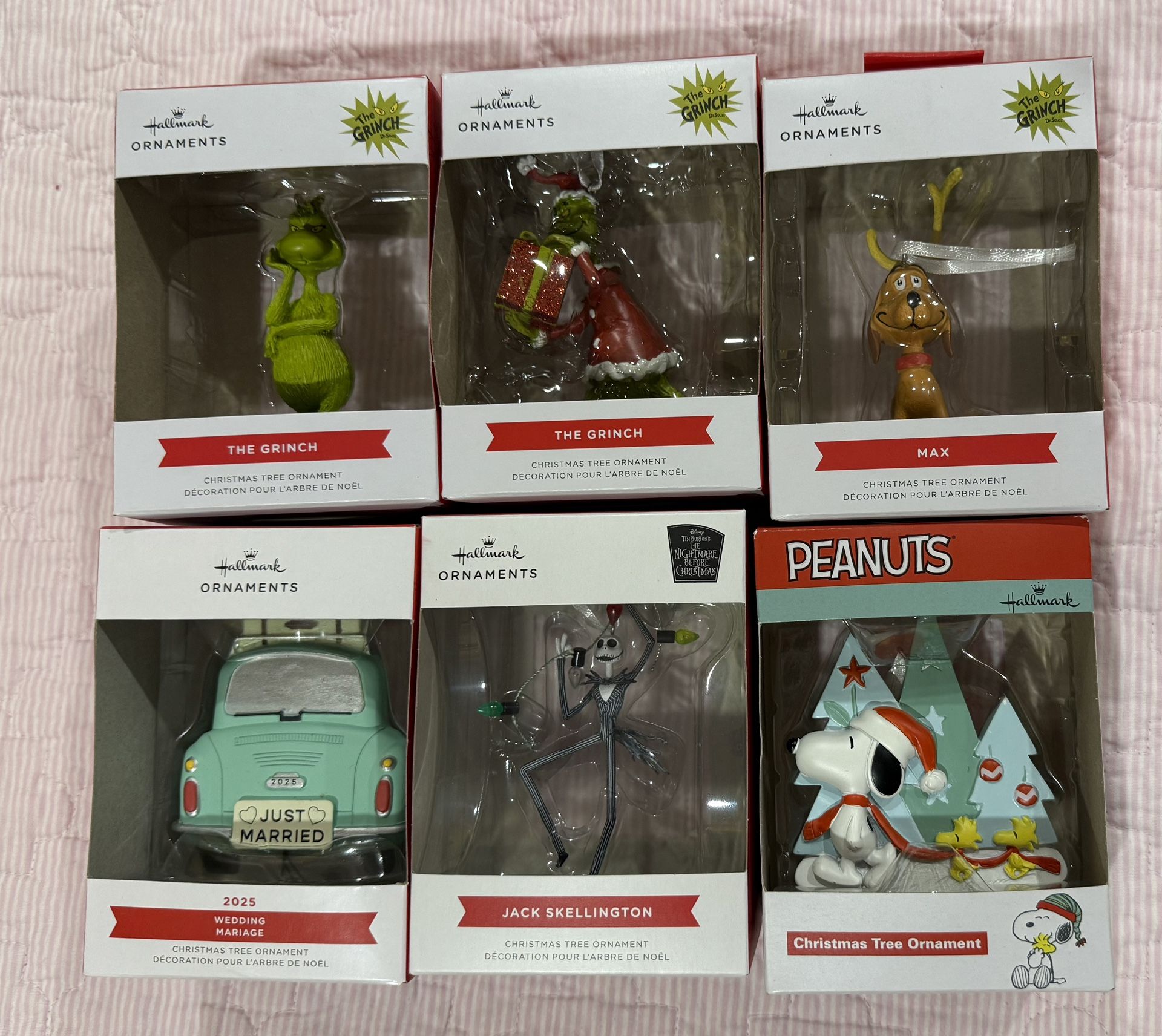 Christmas Ornaments 1st Row: The Grinch, The Grinch, Max 2nd Row: 2025 Wedding Mariage, Jack Skellington and Snoopy $5 each ornament