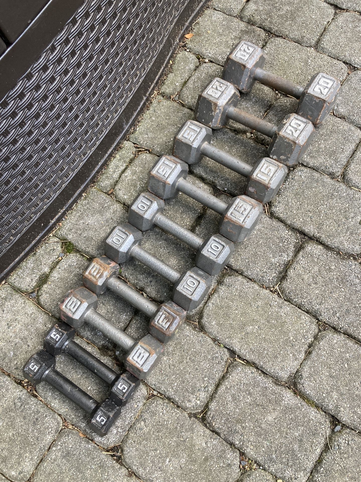 Complete set of 5 lbs to 20 lbs steel hex dumbbells. 5 pair set consists of: 2x5 2x8 2x10 2x15 2x20 Perfect to start your home gym and exercise / workout regimen. I have other larger size dumbbells from 20-120 for an additional cost if needed Tags: Weight plates, weights, bumper plates, olympic barbell, squat rack, adjustable bench, home gym, rig, CrossFit, WOD, workout, train, deadlift, press, dumbbell, LBS, KG