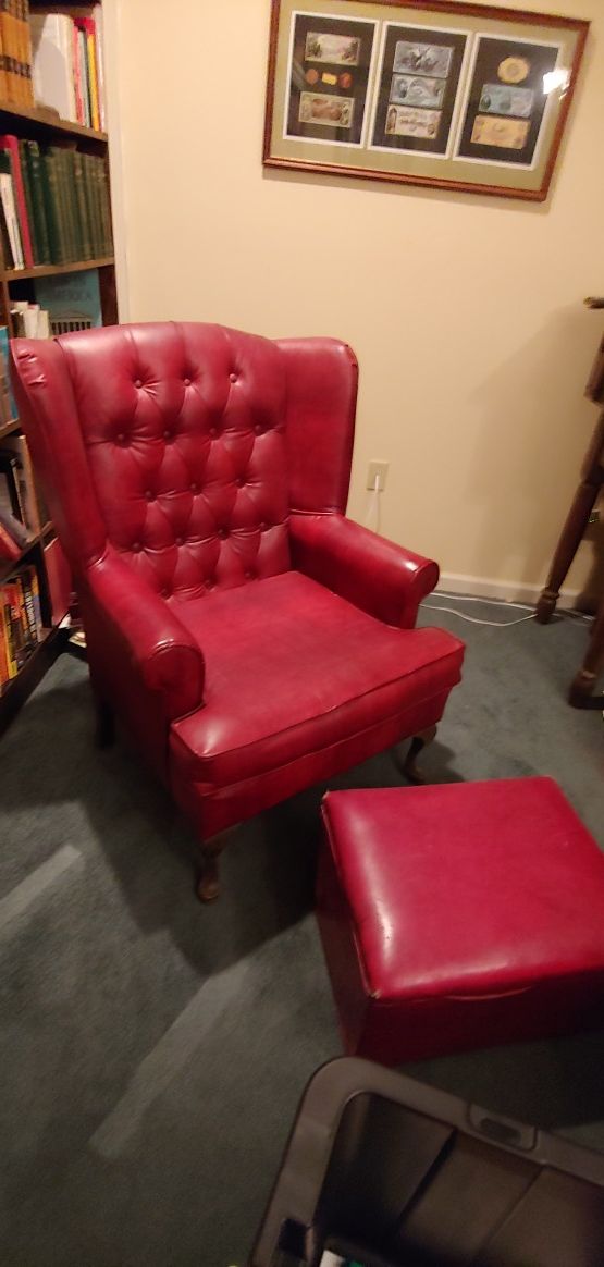 Beautiful red leather chair and ottoman. Vintage, well-made, in good condition. Great find. Best offer.