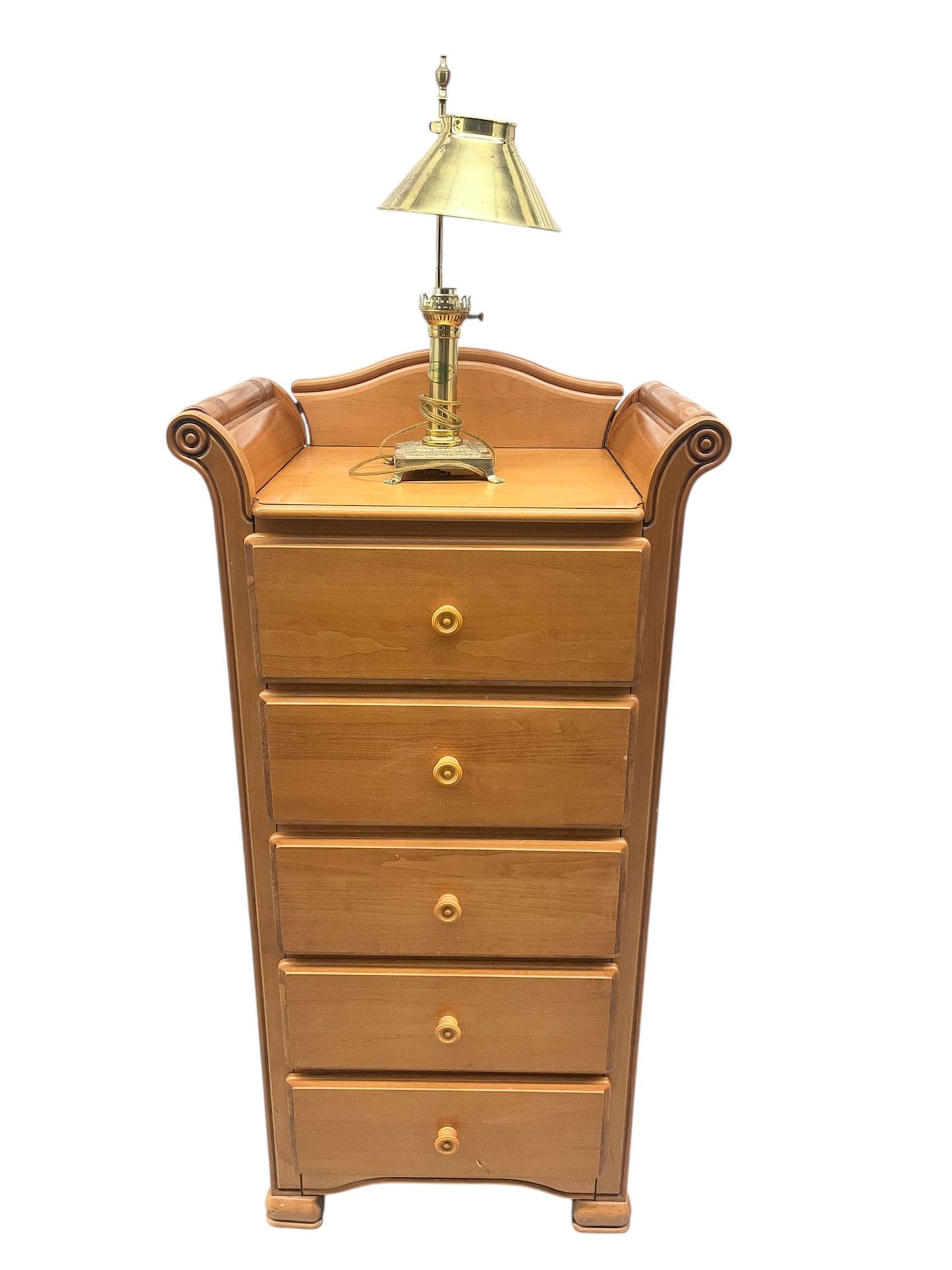 Solid wood Modern made 5 drawer tall narrow dresser. Height to back . 53.75 in height to top surface 47.75. Length 26.5. Width 19.5. Smooth drawer functionality on sliders. Good condition overall- not perfect- does have some nicks and scratches. Scroll through my listings and reviews. Pickup location is an indoor climate controlled storage facility with metal carts. I will assist load. Scroll through my listings and reviews!