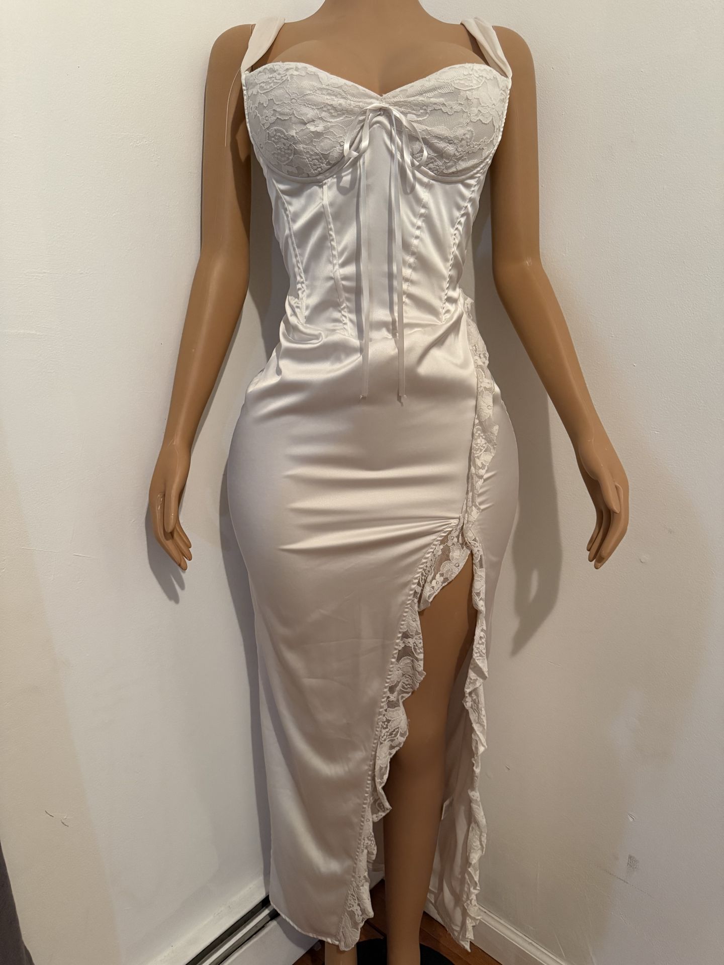 Used once- good condition White satin bodycon dress featuring a flattering side slit and delicate lace detailing for a feminine touch. Smooth, silky fabric with a fitted silhouette that hugs the body beautifully. Gently worn and well cared for—no stains, rips, or flaws. ✨ Size: Medium ✨ Color: White ✨ Condition: Great, gently used ✨ Perfect for date nights, special occasions, bridal events, or evenings outfit