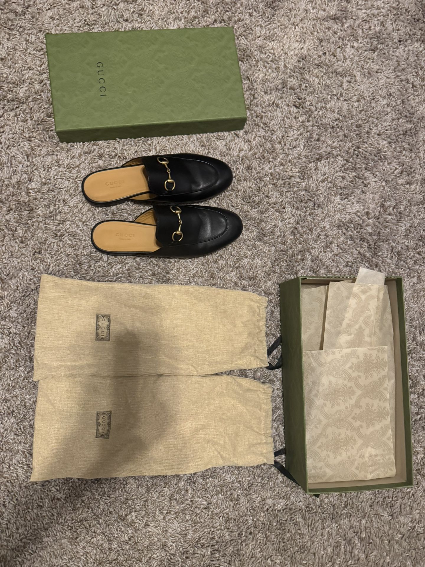 Description: Gucci mule slide—reintroduced in classic, polished leather with symbolic Gucci horsebit. 0.5" flat heel. Rounded apron toe. Golden horsebit detail. Leather outsole. Slip-on style. Made in Italy. Size: 37 1/2 Color: Black Other: -Comes with original box and shoe sleeves -Shoes have only been worn once -Soles are the most worn out, the rest of the shoes looks like new -Willing to negotiate -Contact me for more info (quick response 1-3 days)!!!