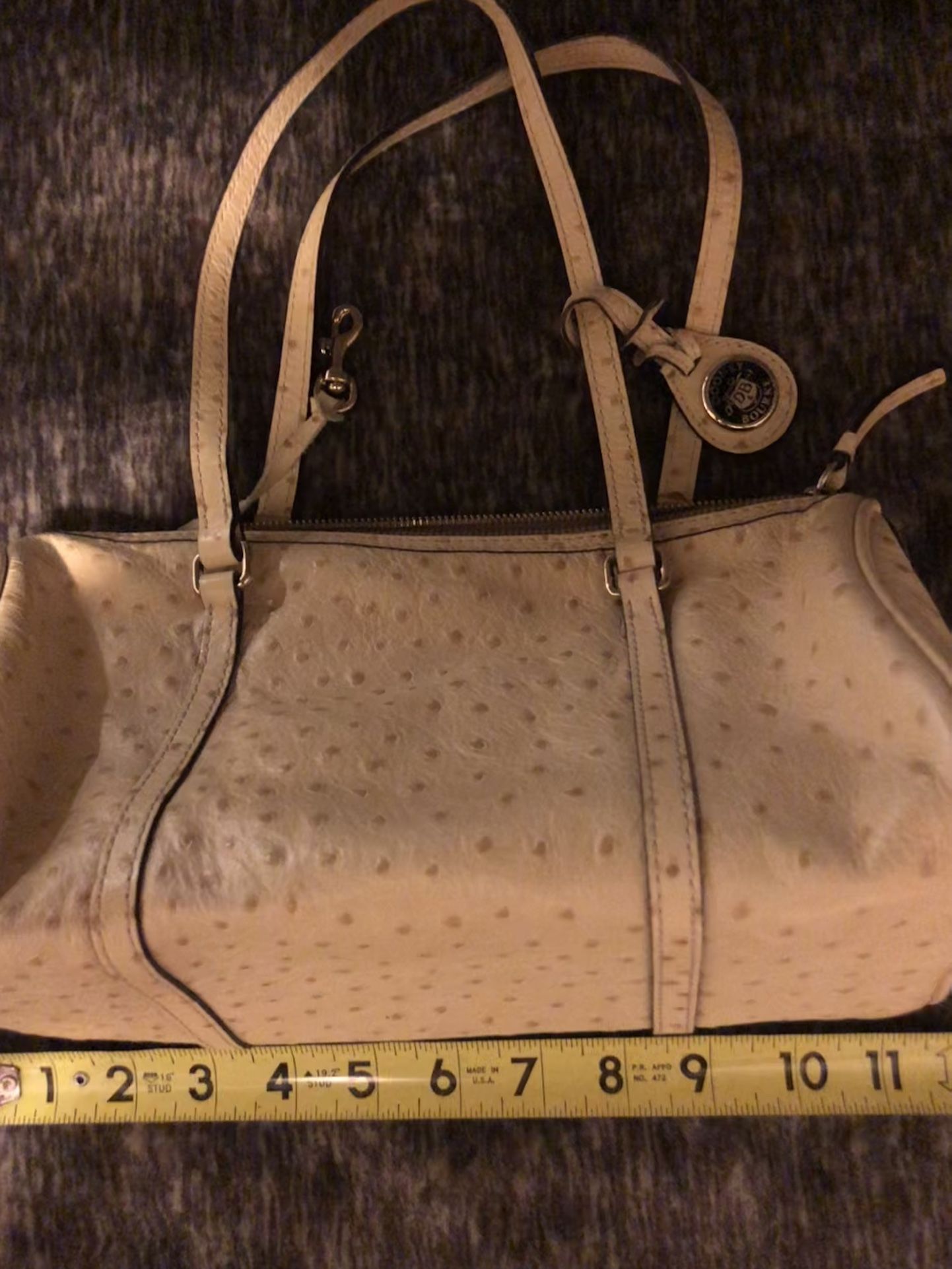 Genuine Dooney & Bourke Ostrich Leather Barrel Bag Great bag, gently used, very clean. Beautiful embossed ostrich leather. 11" long, 6" high, 5" deep, strap drop 9". Top zipper closure. Interior is very clean fabric, 2 inside zip pockets, 2 slip pockets, cell phone pocket, key clip. Dooney & Bourke fob on leather attachment.