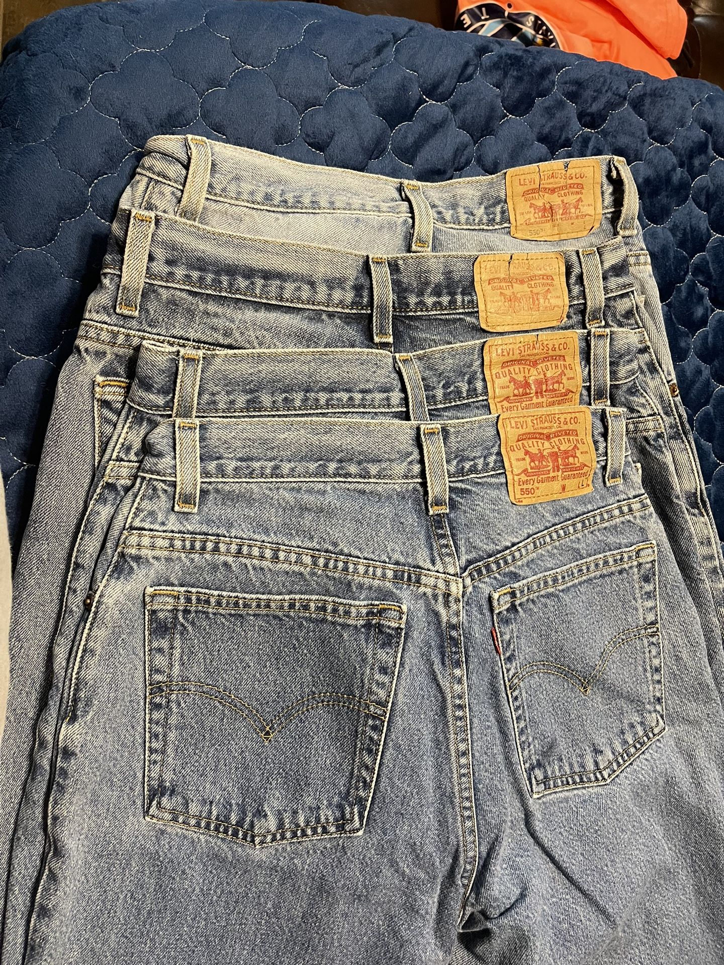 Original 550 Levi’s size 10 long. good sturdy jeans tapered leg made with denim feel very comfortable. 12 each or 40 for all