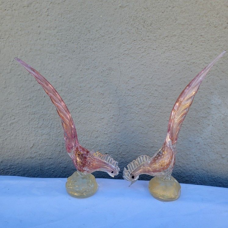 PAIR 1950s Murano Glass Pheasants - Seguso 13" mid-century Murano Glass Pheasants with Swirl Bases and Gold Dust in the style of Archimede Seguso Measurements 13" high By 3 inches Base. Condition: Good Condition. 1 has a broken beak. See the pictures for more details as they are part of the description