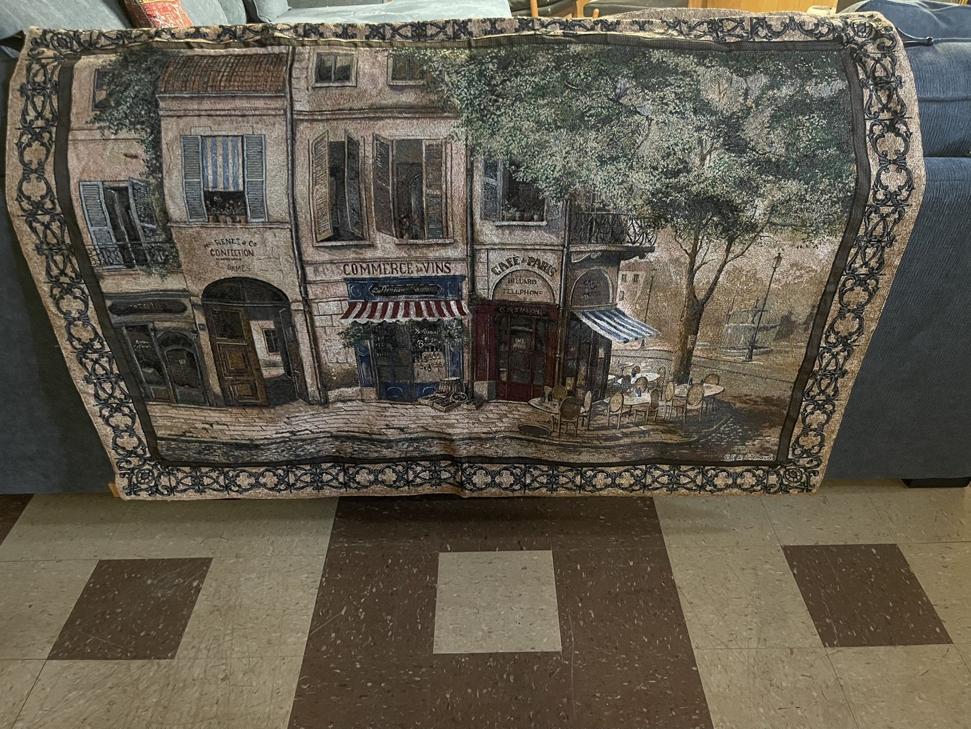 Paris street scene hanging tapestry measurements are approximately 54” length by 38” height. Comes with board in bottom seam and road with hangars.