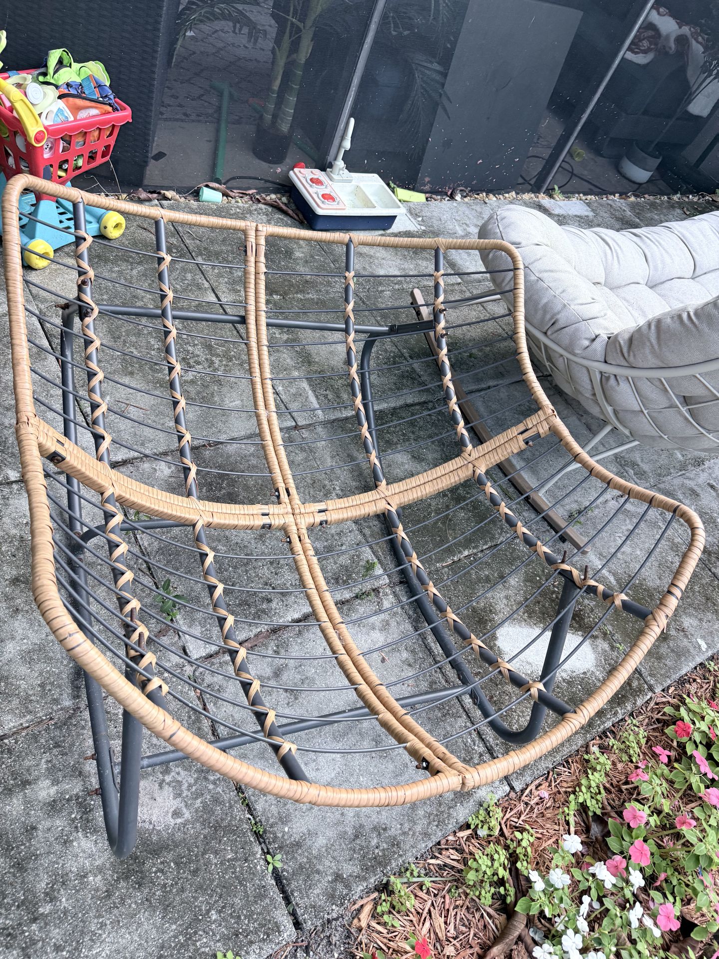 3-piece outdoor patio seating set. ✔️ Includes 2 chairs + 1 loveseat ✔️ Sturdy metal frames ✔️ Very comfortable cushioned seating ✔️ Great for patio, porch, or backyard Cushions have some light outdoor wear but overall in good usable condition