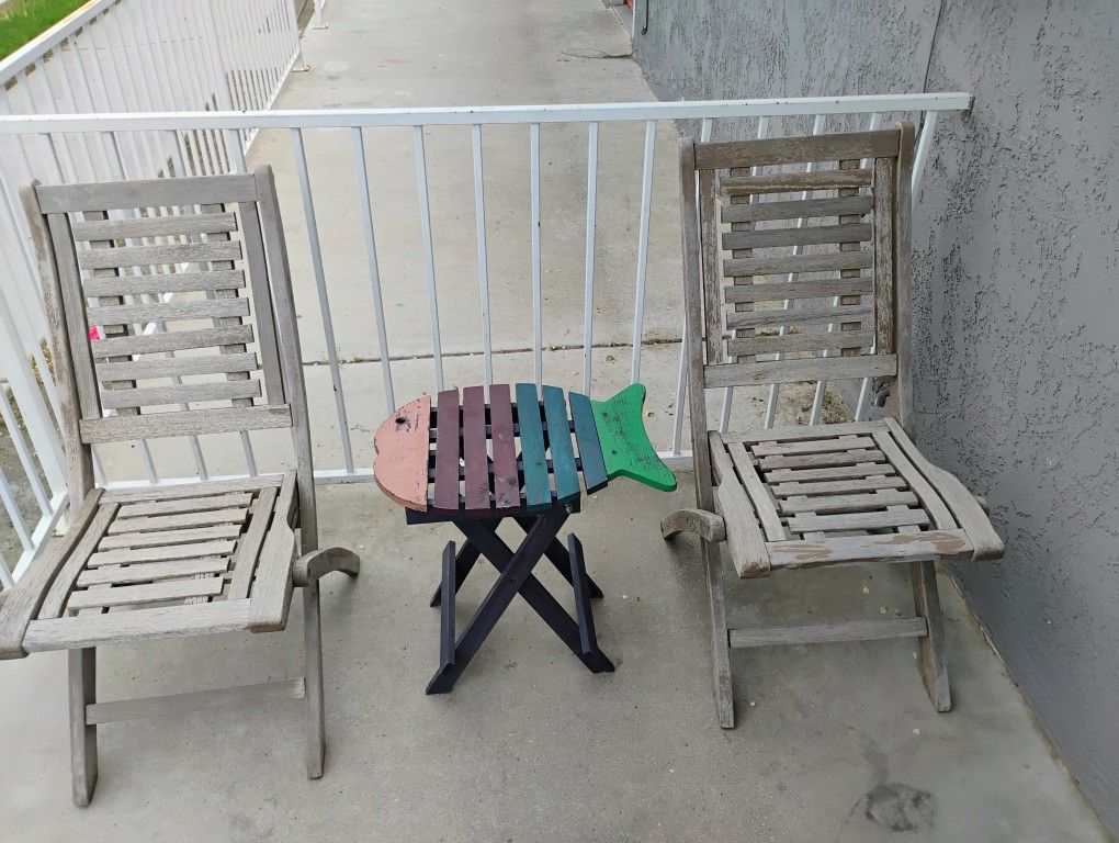 Vintage patio set two chairs and a fish design table all three items fold very cute patio set can be painted or can stay that color