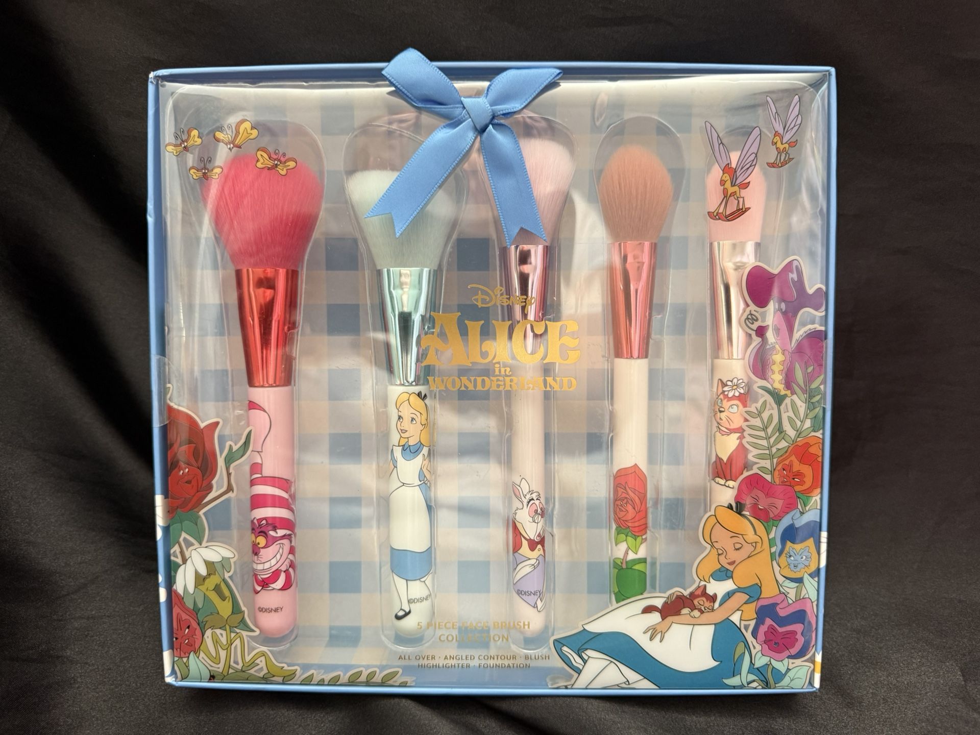 New Disney Alice In Wonderland Women's 5 Piece Makeup Brush Set Cosmetics. All Over Brush Blush Brush Angled Contour Brush Highlighter Brush Foundation Brush