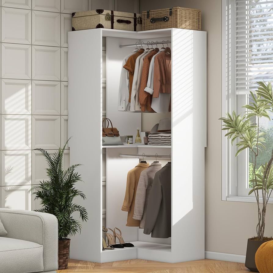 L390 $100 Corner Closet System, 32 Inches Wide Wood Corner Unit with 2 Hanging Rods and All Hardware Kits, 3-Tier 80'' Height Corner Wood Closet Tower, Grey Color Grey Material Wood Unit Count 1.0 Count Mounting Type Freestanding Finish Type Painted Corner Closet System for Small Corner - Do you feel frustrated because you have a small corner at home where you want to put things but can't find a suitable corner closet system? Armocity corner wardrobe rack has 2 hanging rods and 3 storage shelves which can store all your storage needs for your small corner space. The corner design creatively provides enough storage to organize your clothes without taking over your floor space. The wardrobe storage will blend into your current home decor. 150pcs Clothes Capacity Closet Organizer System - Armocity 4ft heavy-duty wardrobe rack comes with 2 hanging rods that can hang long dresses, T-shirts, suits, and jackets. and you can also put your storage boxes, shoes, baskets, folded clothes, and bedding in this freestanding closet system. You can put about 100-150 pcs of summer clothes. It can make the clothes in a clean condition even if you put the clothes in a corner. Multi-Functional Corner Closet - This corner closet is multi-functional, you can not only use it as a corner closet system but also it can be used as a corner storage cabinet. It is ready for life, including food, housing, and clothing. Much Sturdy and Stable Than the Metal Clothes Rack - Usually the material of this large garment rack is high-quality board not like the shaking metal, so the sturdiness and durability are much better than the metal garment rack. This Wardrobe closet is often placed in any room of the house. This type of cabinet is usually made in the form of garment storage which should be sturdy. AMF-AC-ZHYJ-ZJYG-WO