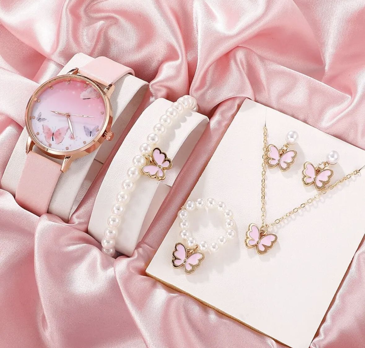 6PCS Set Women Fashion Quartz Watch Female Clock Pink Butterfly Dial Luxury Bran
