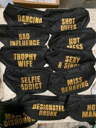 Black Fanny packs with gold lettering, white “BRIDE” Fanny pack with gold lettering. Brand new, never used. Package was only opened to take a photo of all the phrases. 12 bags total, one bride and 11 bridesmaids. Meet in north Burien. Regular price from website is $55. Selling for $40 or best reasonable offer.