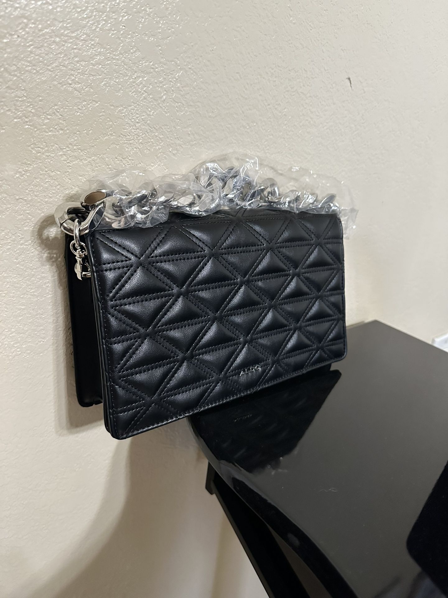 Aldo Black Purse With Silver Chain and a long black crossbody strap.