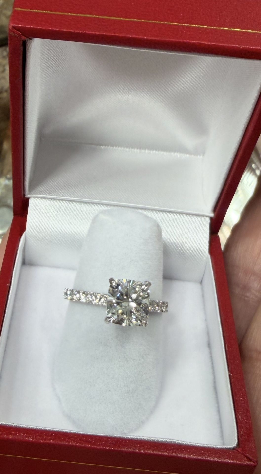 IGI certified diamond ring . It's 14k white gold . Purchased from rare carat. Size 6.25. The center is a 2.08 ct cushion cut solitaire center with 0.55 carat diamonds on the setting . Paid $2500 and letting for for steal 🚨 price . Ring is new Hablo and espanol