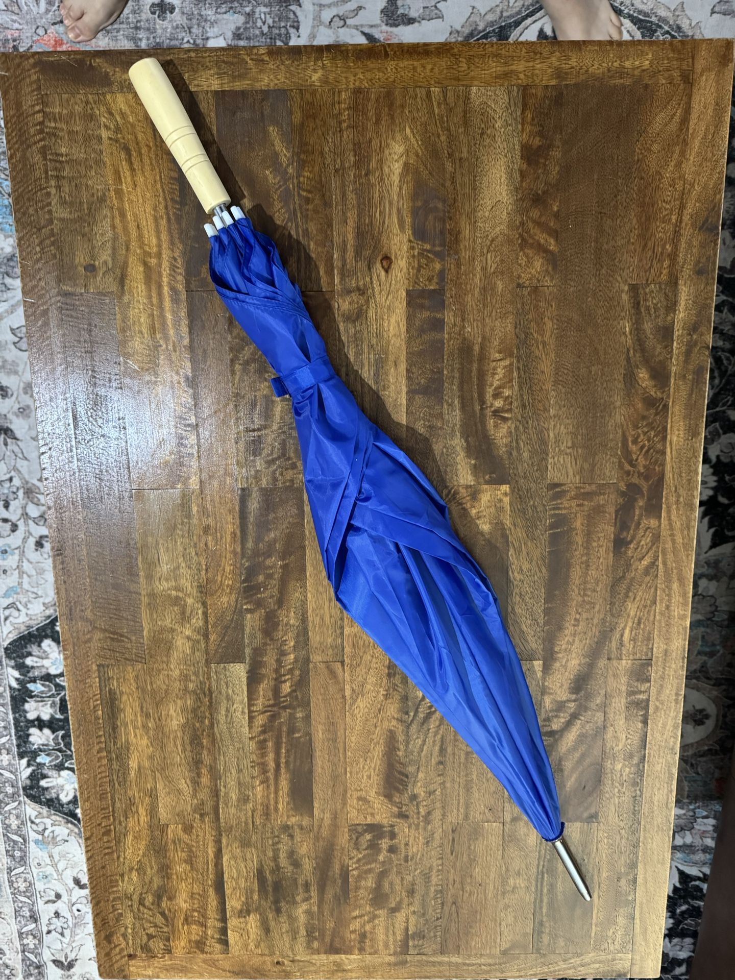 blue stick umbrella with a wooden handle