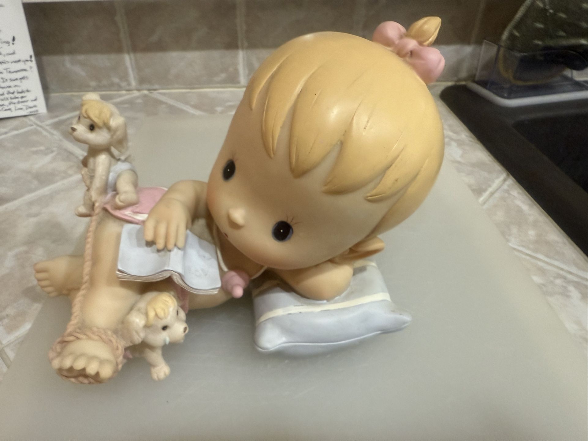 Google search CANNOT find the name for this PM figurine in (also known as "Girl Reading to Dog" or "Girl with Puppies"), produced by Precious Moments. This specific piece depicts a young girl reading a book to two puppies. This piece MAY BE a vintage collectible from the "Original 21" collection, first released in 1979 Approximate Height: 4.4 inches Brand: Precious Moments Original Year: 1979 Material: Bisque porcelain, which is unglazed Landrun Lane Arlington 76017