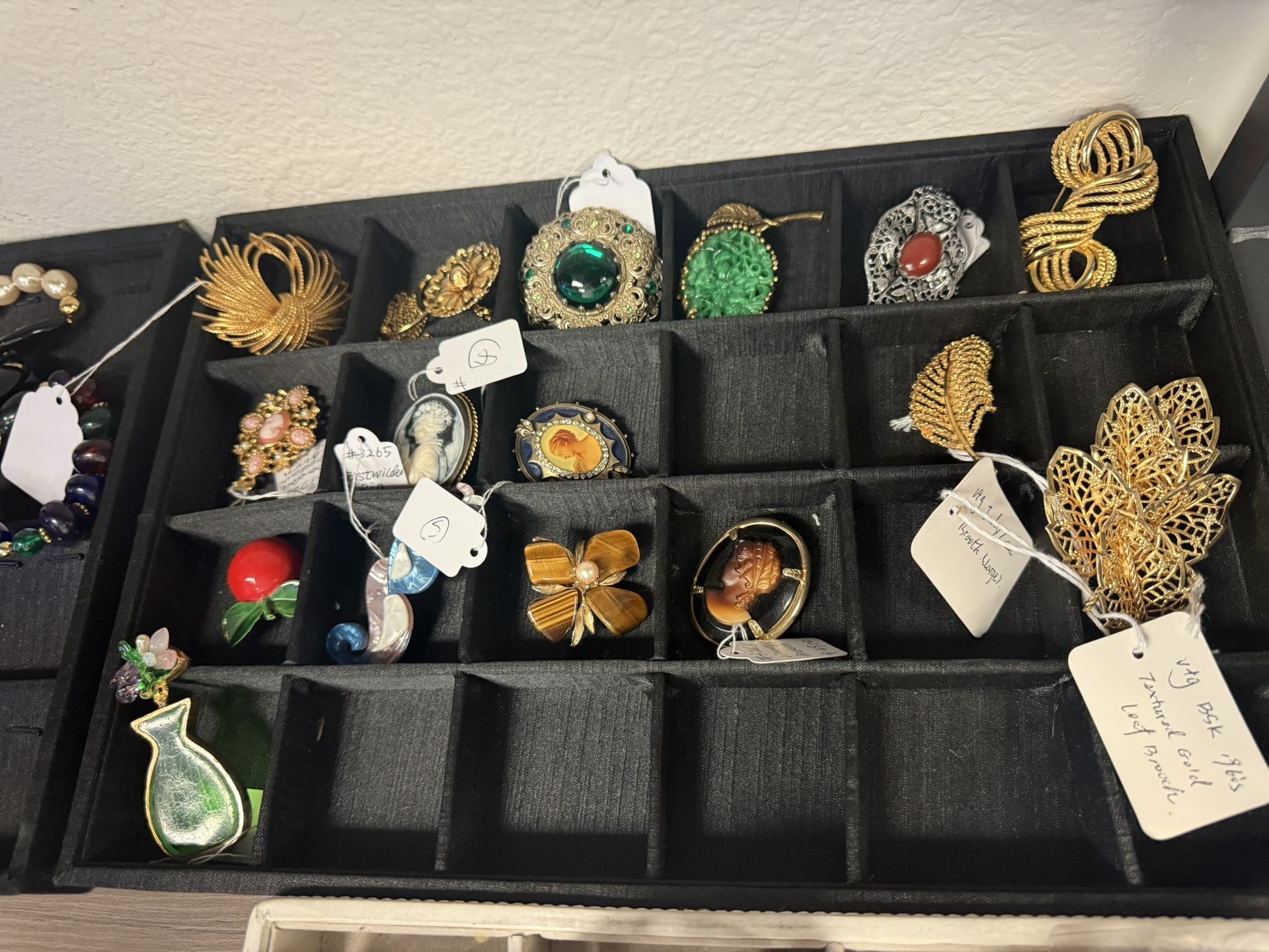 A stunning collection of vintage brooches featuring gold and green accents. Perfect for adding a touch of elegance to any outfit. All vintage brooches. $49 for Each, one for each, first come first choice.