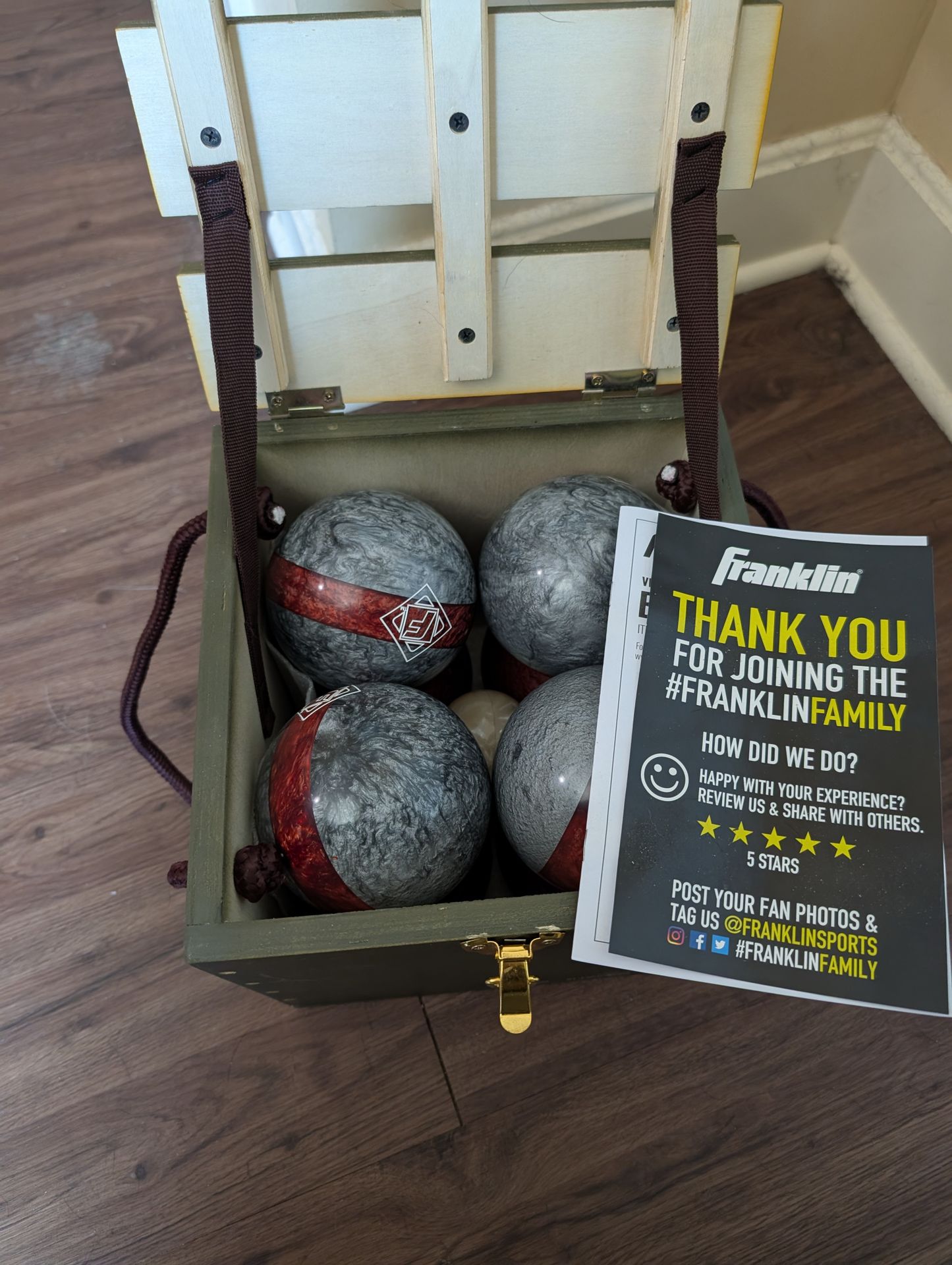 Never been used Franklin vintage bocce ball set. Comes with a rustic looking box with strong rope handles 4 grey marbled, 4 red marbled, and one small white marbled balls.