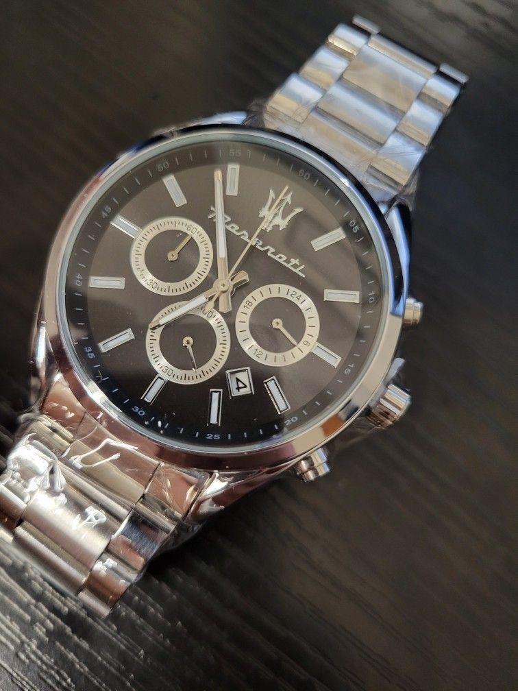 Brand New - Works Perfectly - Watch Only Bezel Color Silver Year Manufactured 2020-Now Band/Strap Bracelet Handedness Left Case Color Silver Department Men Watch Shape Round Style Casual, Classic, Dress/Formal Case Size 45 mm Features 12-Hour Dial, Chronograph, Date Indicator Case Material Stainless Steel Movement Quartz Water Resistance 30ATM With Papers No Brand Maserati Band Color Silver Band Material Stainless Steel Dial Color Black Band Width 22 mm With Original Box/Packaging No With Manual/Booklet No Country/Region of Manufacture Italy Display Analog