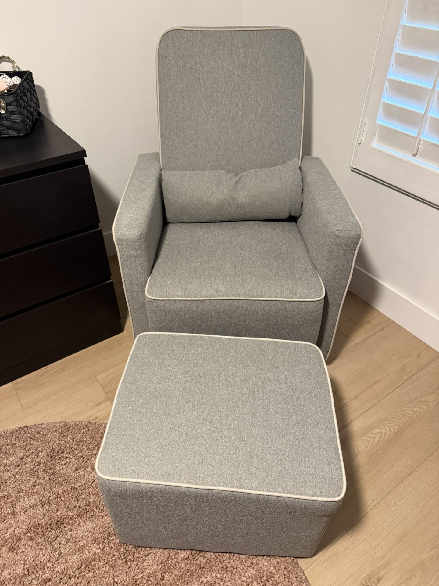 Grey chair with ottoman. Rarely used. Great for a nursery/baby room. Very comfortable