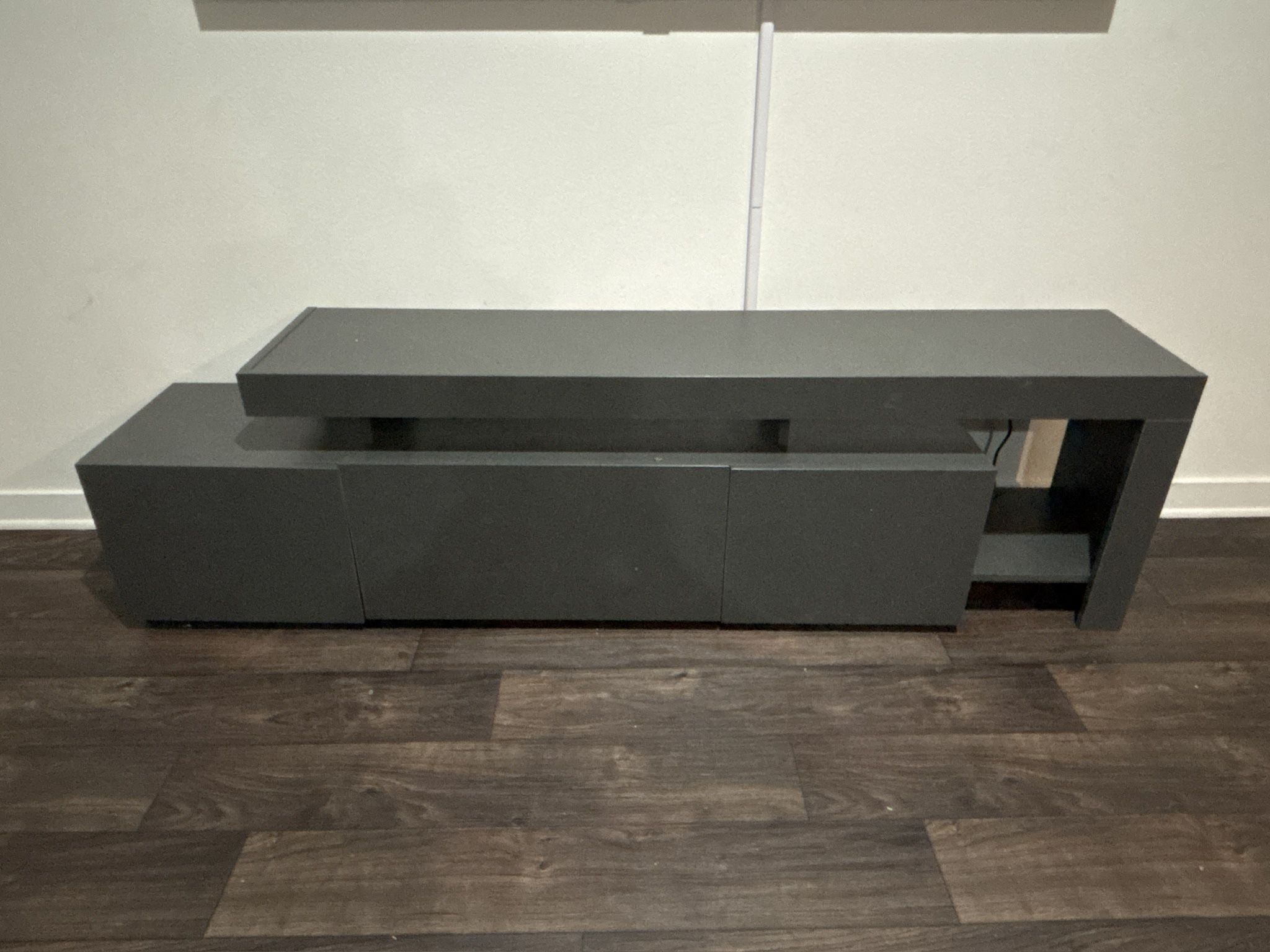 Sleek, modern dark gray entertainment center in great condition. Features multiple cabinets and open shelving for media devices, gaming consoles, and storage. Clean, minimalist design that fits well in modern or contemporary living spaces. Sturdy and well-built with minor cosmetic wear from normal use (see photos). Perfect as a TV stand or media console. Details: • Color: Dark Gray • Style: Modern / Minimalist • Storage: Cabinets + open shelves • Condition: Good • Pickup only Priced to sell. Message me if interested!