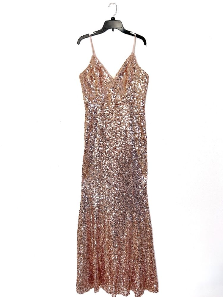 Vestido de fiesta largo (talla L), hecho con lentejuelas color rosa dorado. Long party dress (size L), made with rose gold sequins.