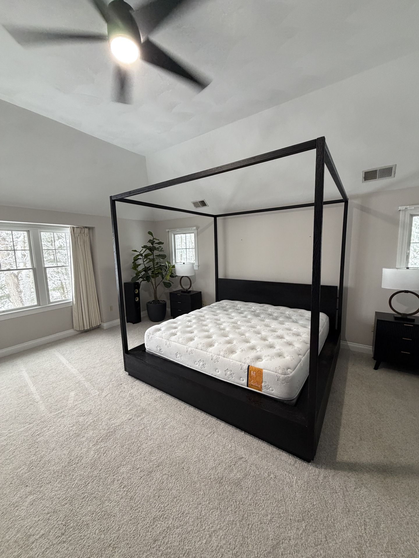 Restoration Hardware Machinto Canopy Bed Frame in Black Oak Wood King Size Retail Price: $7,395 Includes *PranaSleep Lotus Asana 6.2 Plush Mattress.* in Spectacular condition with an original retail price of *$4,499* 102" King Bed: 90"W x 89½"L x 102"H Headboard: 83¼"W x 40"H Floor to Top of Slats: 11½" Floor to Top of Mattress: 25½" (based on 14" mattress) Space for Adjustable Base: 77"W x 80½"L Weight: 524 lbs. Serious inquiries only, pickup only, Denham, MA Message for questions