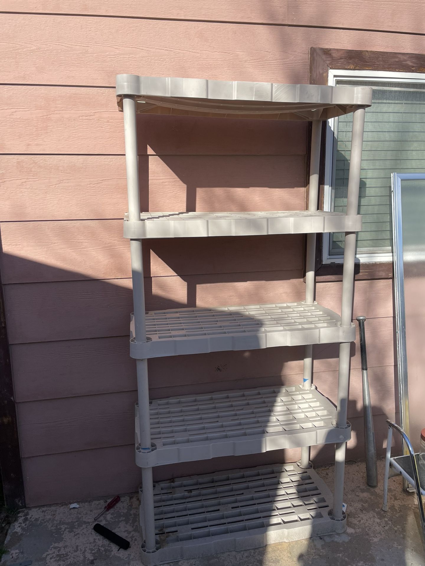 Heavy duty Four-tier plastic shelving unit, it does come apart ideal for garage or outdoor use.