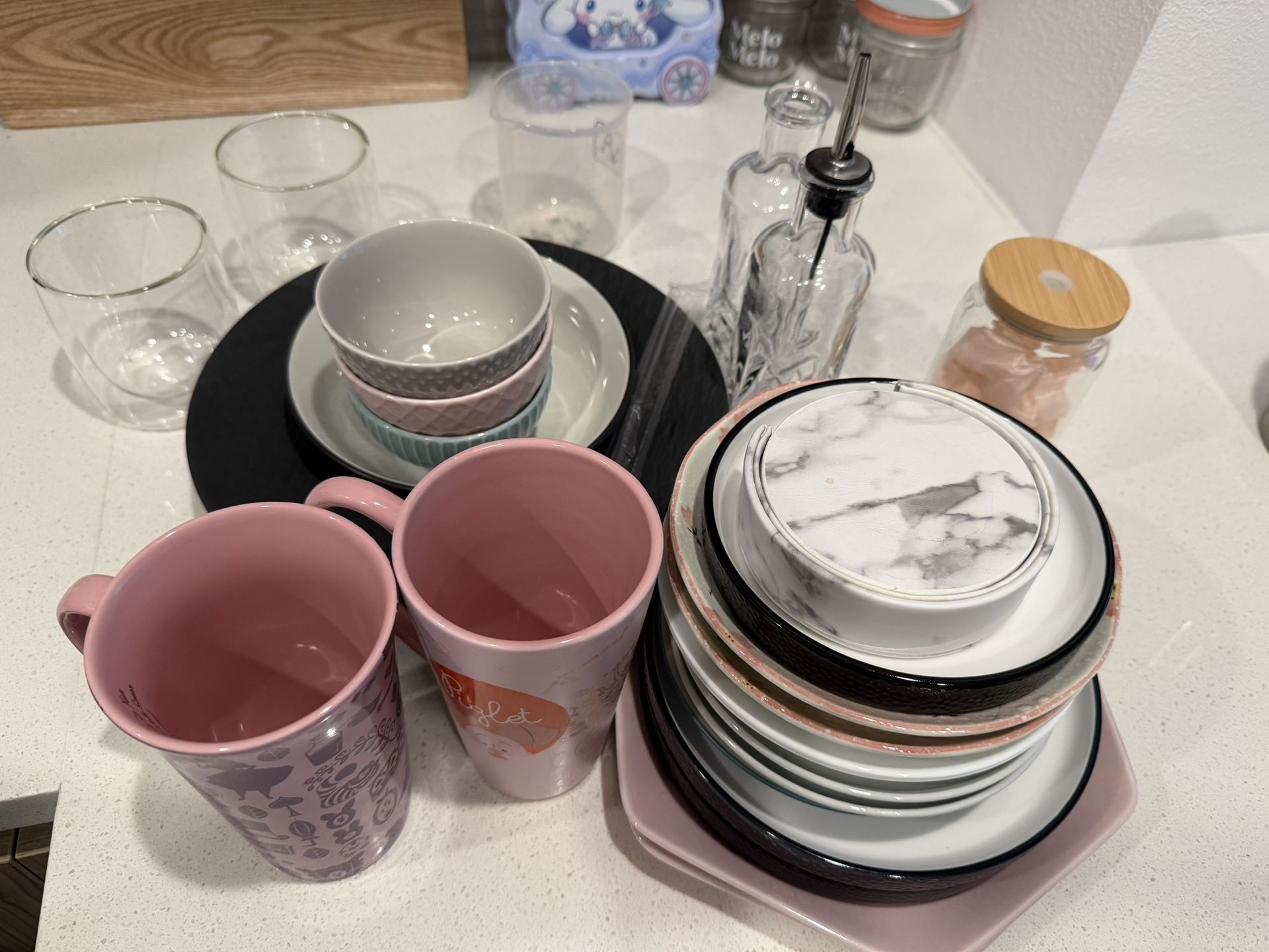 Selling a 23-piece kitchenware bundle — everything goes together as one set. Includes: • Coffee mugs (mixed styles and sizes) • Plates (dinner and salad) • Small bowls • Glass jar • Olive oil dispenser All items are clean, gently used, no cracks or chips. Great starter set for an apartment, student, or Airbnb kitchen.