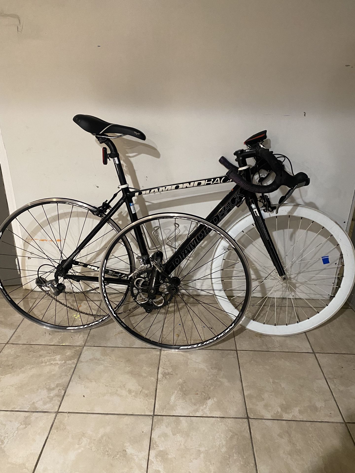 Equation SE and white wheel all need inner tubes and tires The front equation wheel need a new axel All rims are 700cc 24-27 Bike needs a tune up Cash or Apple Pay only Willing to accept trades Or a 54 size bike frame