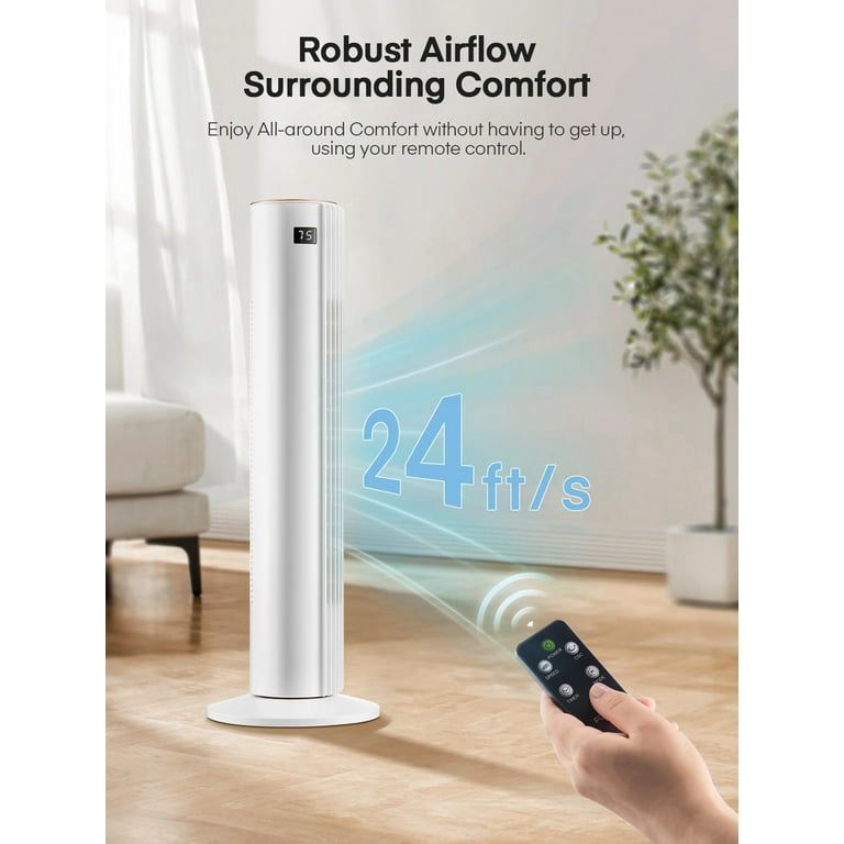 Powerful Airflow: This 30-inch tower fan delivers high-speed, refreshing winds at up to 24ft/s, effectively cooling living spaces. Quiet Operation: Featuring an algorithmic impeller design, the fan operates quietly, ideal for bedrooms and offices, with a display auto-off in sleep mode. Wide Oscillation: With 70° oscillation and an optimized airflow path, this fan ensures widespread cooling coverage throughout a room. Customizable Settings: Offers 3 wind modes (Normal, Natural, Sleep) and 3 speeds (soothing-soft to storm-strong) for personalized comfort, controllable via panel or remote. Compact Design: The fan features a compact design with a hidden handle and a built-in remote compartment, making it versatile and easy to move. Technical Specifications: Operates at AC 120 V, 60 Hz with a 45W power output, and includes a 12-hour timer.