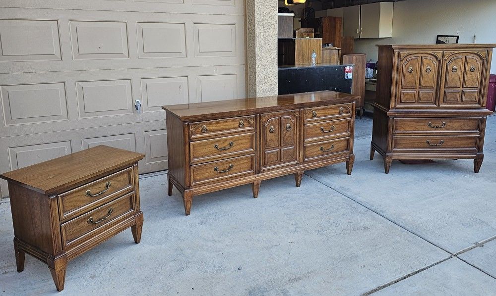 Vintage Dixie Dresser Set in good condition. Includes long 9 drawer dresser, tall 5 drawer chest, and a single 2 drawer nightstand. All dovetailed drawers work well. There is some wear consistent with age. Long Dresser 72×19×32 Tall Chest 40×19×51 Nightstand 26×17×25