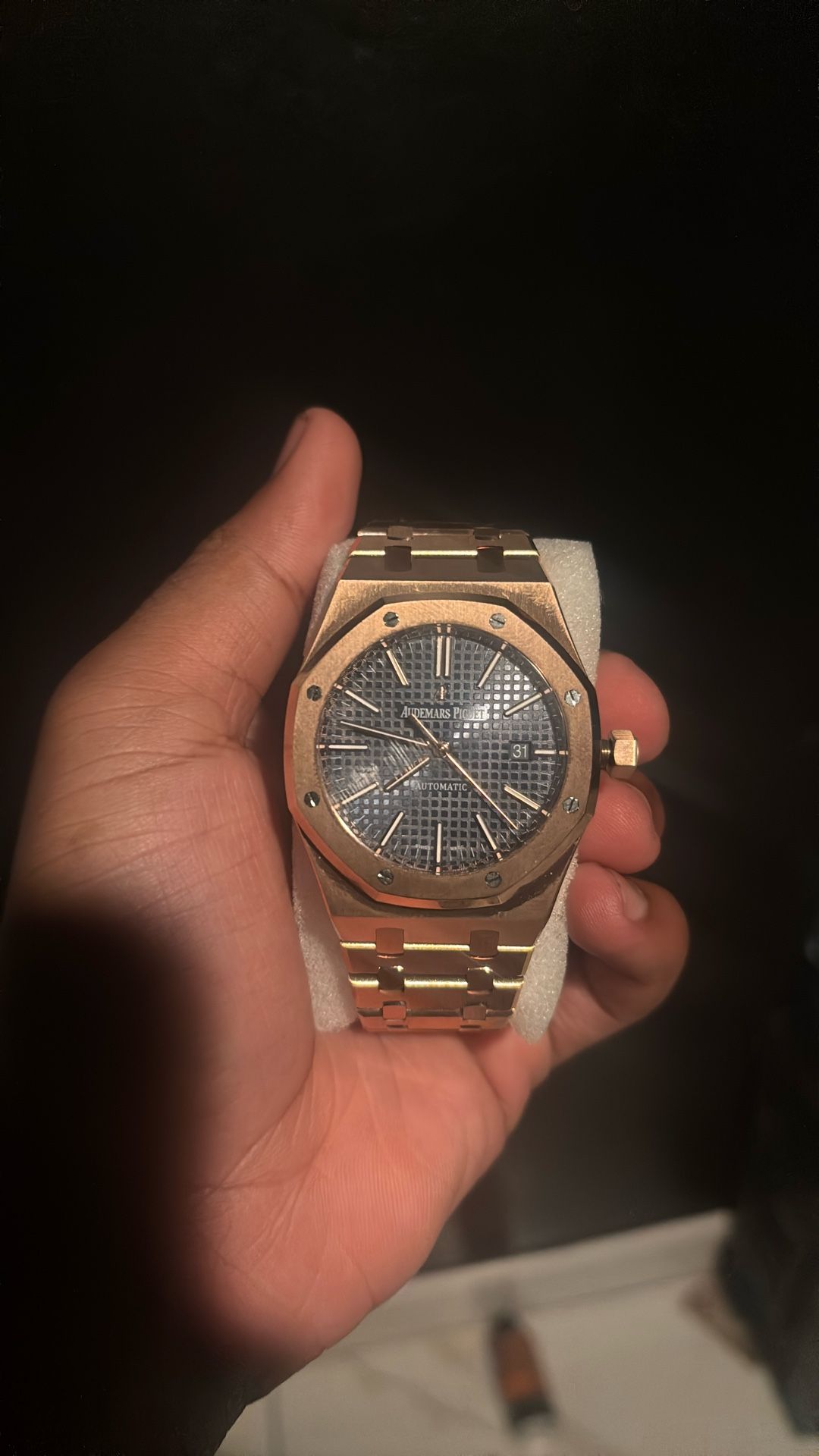 It’s in good condition brand new, weared once or twice. It’s a rose gold Ap rep