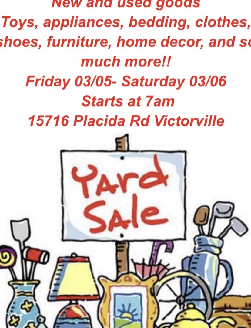 Huge 5 Family Yard Sale Motivated Sellers New and used goods Toys, appliances, bedding, clothes, shoes, furniture, home decor, and so much more!! Friday 03/05- Saturday 03/06 Starts at 7am 15716 Placida Rd Victorville