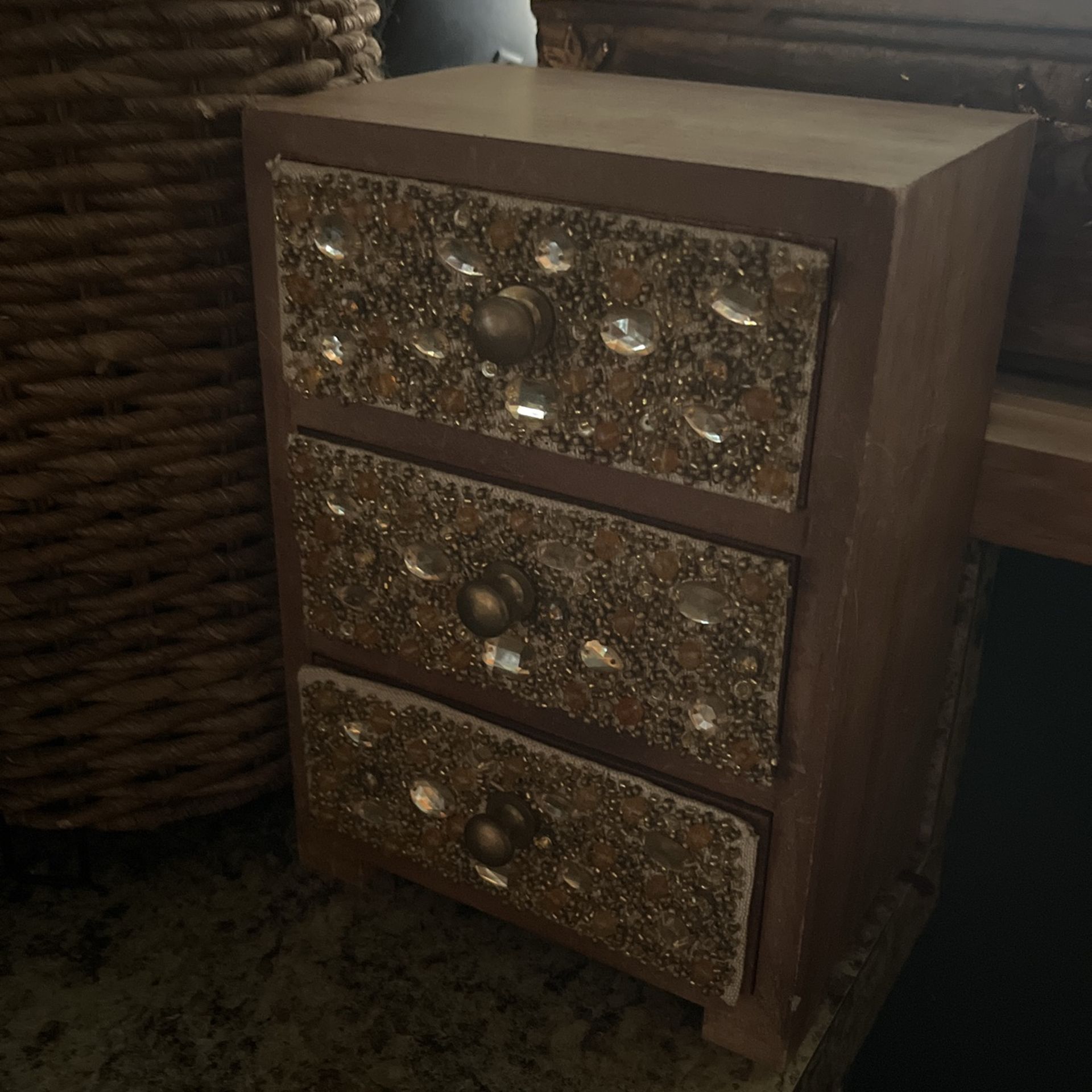 Small Gold Bedazzled Bohemian Chic Trinket / Keepsake Box . 3 compartments . Made of wood . 4 inches in depth 6 inches in width 8 inches in height