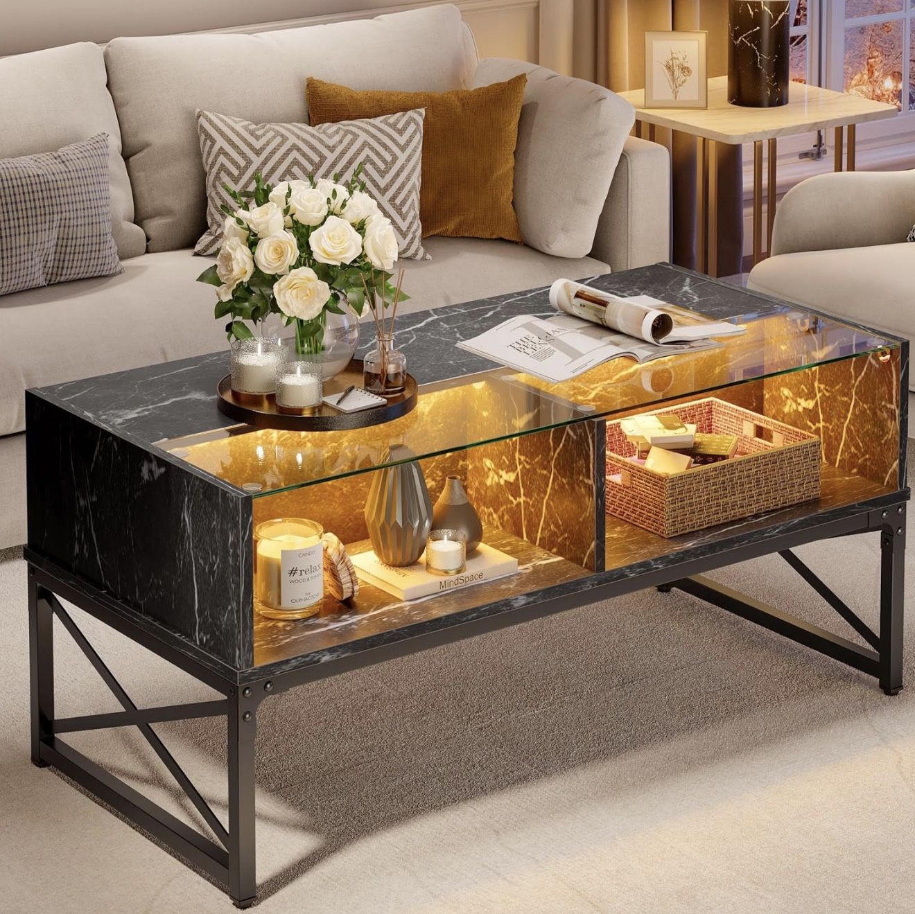 Assembled coffee table Item is in storage, images were pulled from online store Brand Bestier Product Dimensions 21.65"D x 41.73"W x 19.92"H Item Weight 19 Kilograms Maximum Weight Recommendation 58.97 Kilograms Frame Material Glass, Metal, Wood Color Black Marble [COFFEE TABLE LIGHT UP] The coffee table with LED lights is a stylish and innovative choice among living room tables, featuring 20 colors and 22 modes of LED lights.The lights shine through the transparent glass, creating the perfect atmosphere for movie or game nights. [5MM TEMPERED GLASS] The modern coffee table features a glass top, making it a stunning display coffee table and an elegant center table for any living space. Easy to get items clean with damp cloth. [4 STORAGE COMPARTMENTS] The large coffee table not only provides ample storage space but also serves as a perfect dining room table. Its size is ideal for keeping items such as switches, gaming controllers, laptops, PS5, snacks, or any decor organized and easily accessible. [DIMENSION] 41.7”L x 21.7”W x 20”H. Tea table with storage for reception room, dining room, gaming room, bedroom, basement and office. Choose X-shape design and retro brown CARB P2 board for more support and stability. Weight capacity: 130 lbs