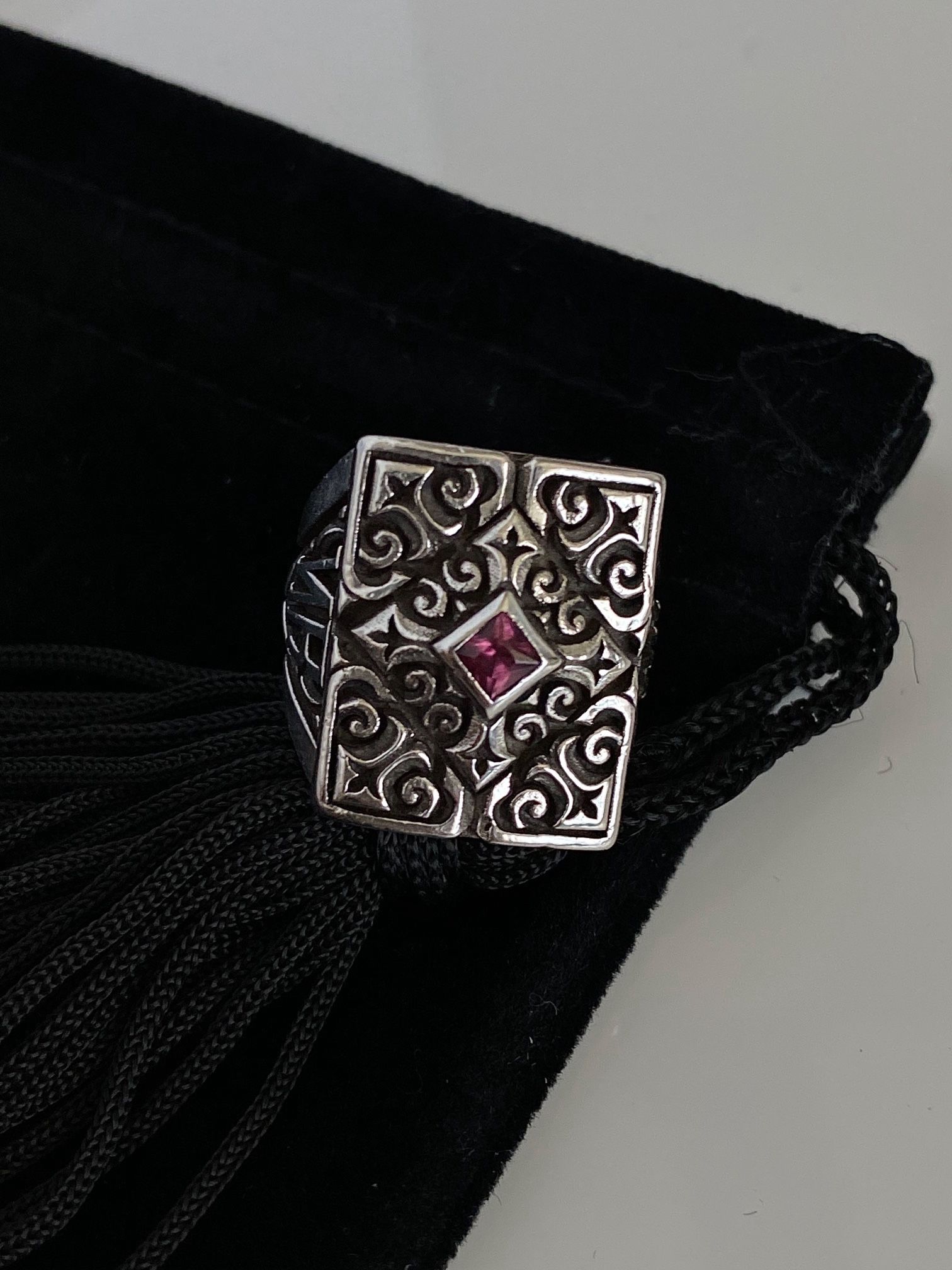 Heavyweight, thick band, sterling silver. Size 6 also fits size 5.5 due to its width. Pre-owned, but in great condition. Highly detailed with a pink tourmaline, Rockstar quality. The original protective Night Rider bag and box are included. Night Rider Jewelry uses genuine, natural, and high-quality, ethically sourced gemstones. Condition: Barely used with minimal signs of wear, professionally cleaned by the Night Rider Store, and ready to wear. Comes from a clean, smoke-free home.