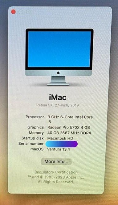High Spec Apple iMac 5k 2019 i5 3.0ghz 6 core CPU 40GB Ram 4gb Radeon Pro 570x graphics card Will come with an Apple Bluetooth keyboard. (Not pictured), professional adult owned, no pets or smoking environment.