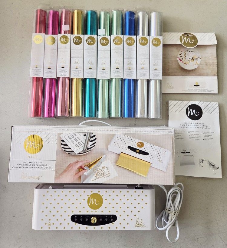 Heidi Swapp Mini Minc Foil Embossing Set with 10 rolls of NEW Foil, 6x6 pack of paper