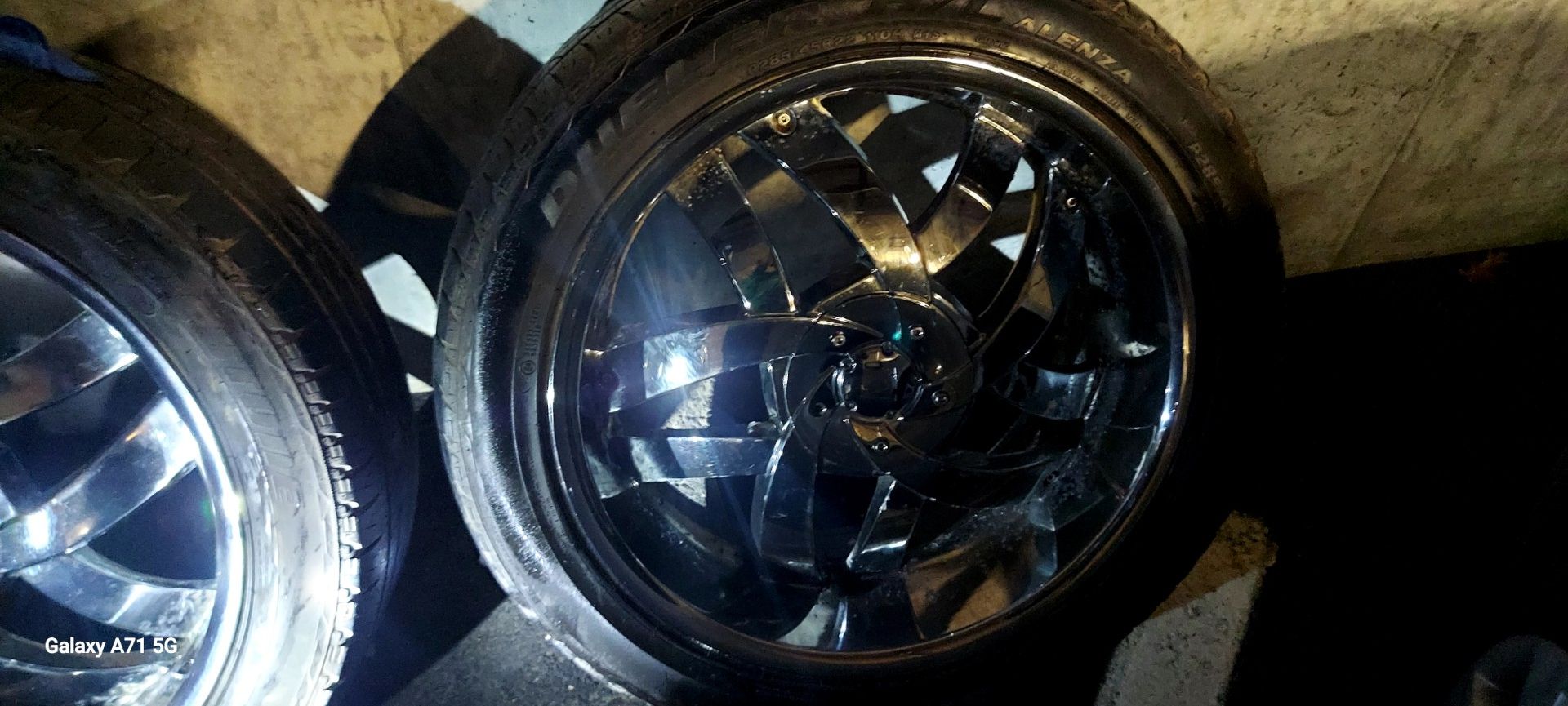 full set of 22" volicity 5 lug rims & tires, all tires hold air , tread good. P285/45R22's . overall condition fair, keep in mind they are not in pefect condition, they need to be cleaned & ran over with steel wool , they have been sitting for awhile. ( 5-Lug universal)
