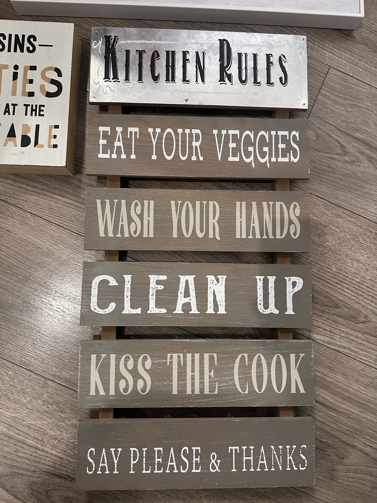 Family frames for home, kitchen long sign. Strong sturdy wood. Cousins table wood frame, and FAMILY white mirror frame. Marcos familiares para el hogar, letrero largo para la cocina. Madera fuerte y resistente. Marco de madera para mesa de “Cousins” y marco de espejo blanco de “FAMILY”.