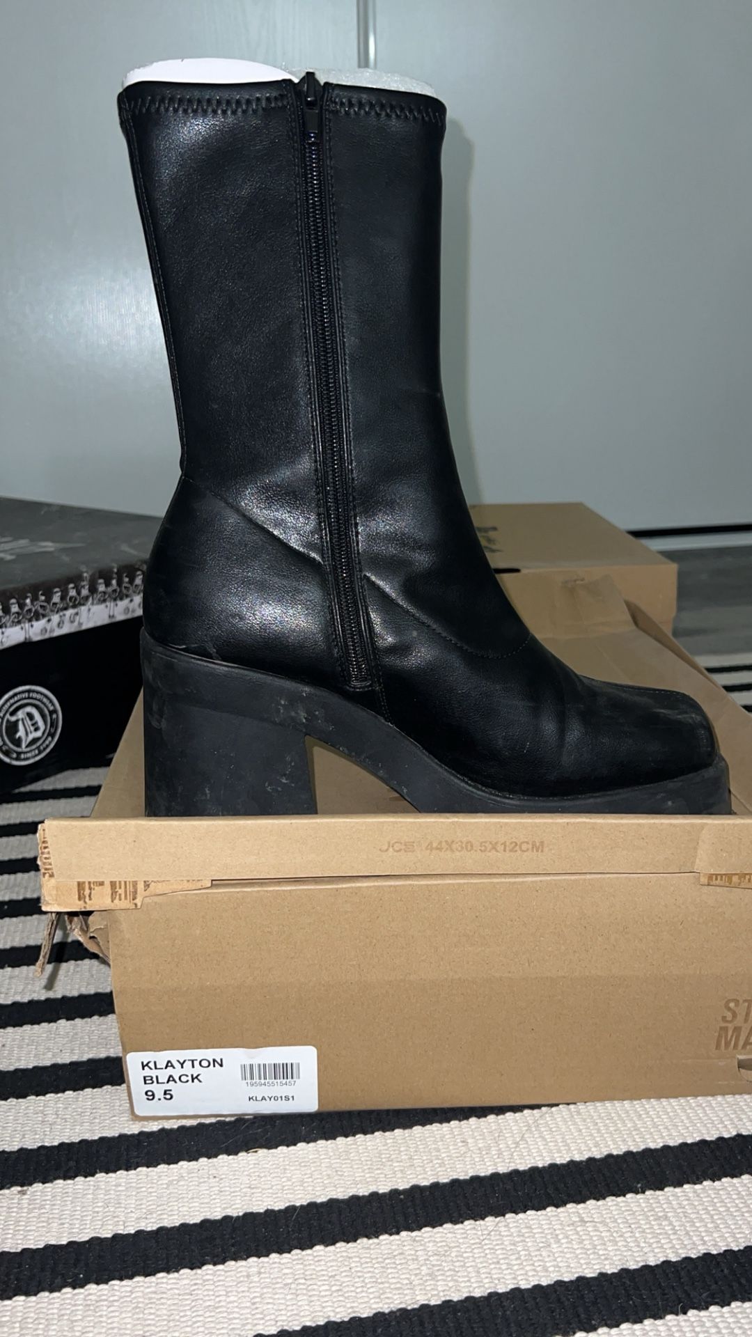 Size 9 women Bring a retro twist to all your looks in KLAYTON. Set on a thick platform sole, these 70s-inspired boots have a close sock-like fit and go with everything from midi skirts to floral dresses. The ultimate throwback! Stretch upper to fit most leg sizes Mid-calf shaft height Looks great with dresses and denim 3.5 inch heel height 1 inch platform 9.75 inch shaft circumference 8 inch shaft height Vegan leather upper material Textile and synthetic lining Vegan leather sock Synthetic sole Fit tip: If you are in between sizes, size up a half-size Imported