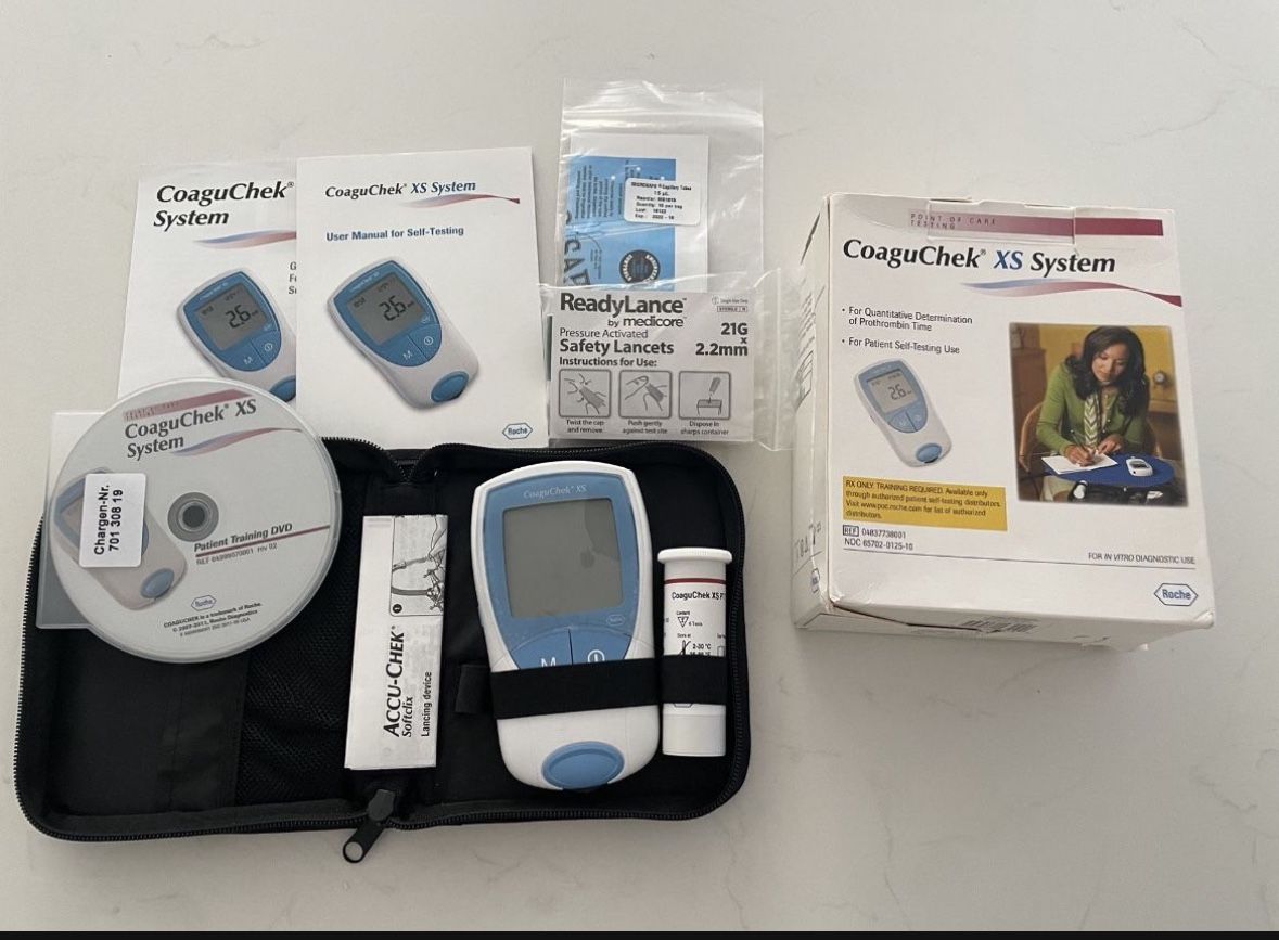 Just LIKE NEW! Only 4 test on this machine before switched off warfarin. You won’t find a newer INR machine. Comes with everything seen in picture. Remaining test strips expired but can still be used Coagusense Coaguchek xs ptinr inr self testing machine.