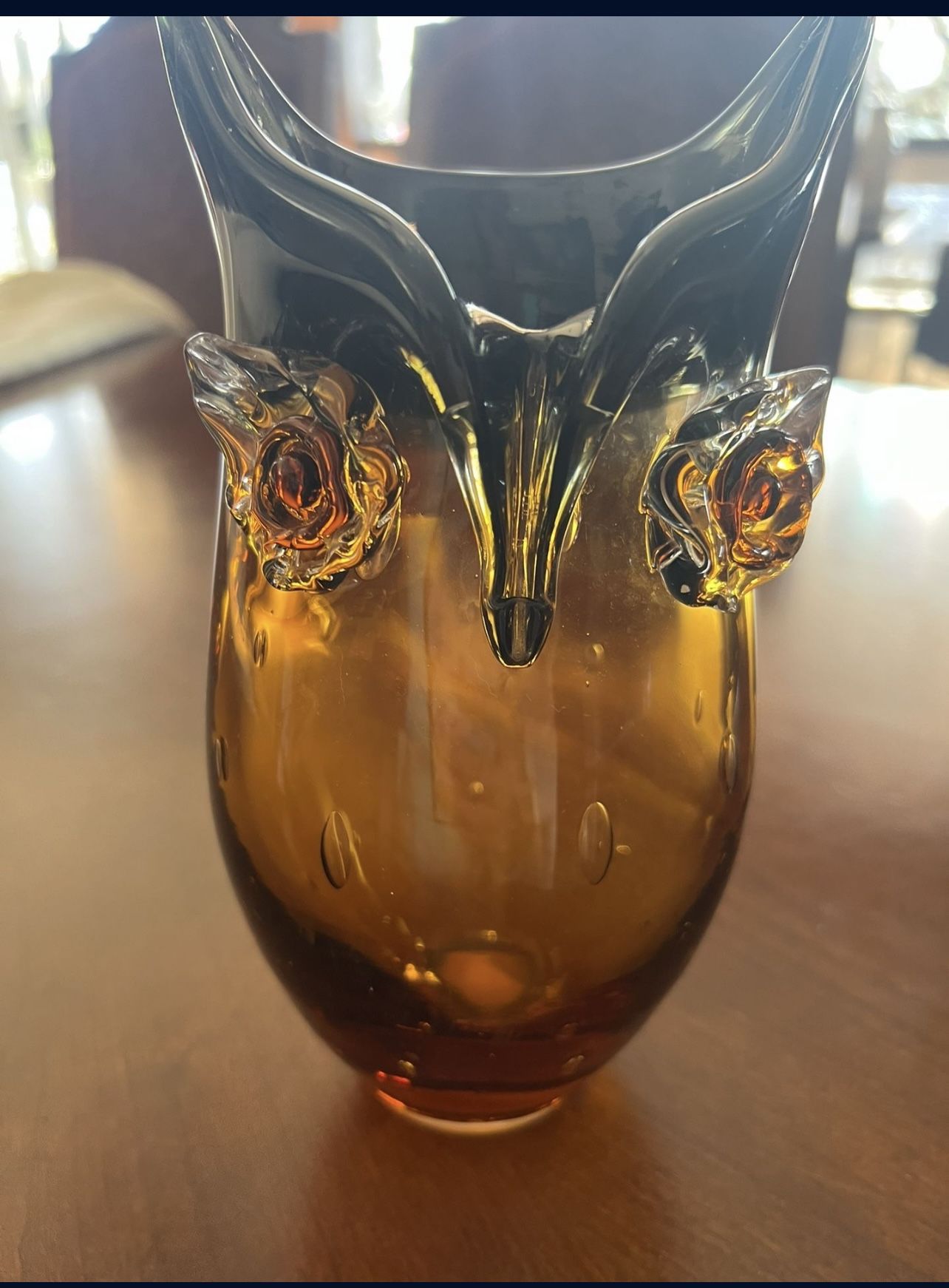 vintage Murano-style glass owl vase 9" tall , likely from the 1960s. Made in Italy, Hand-blown art glass.