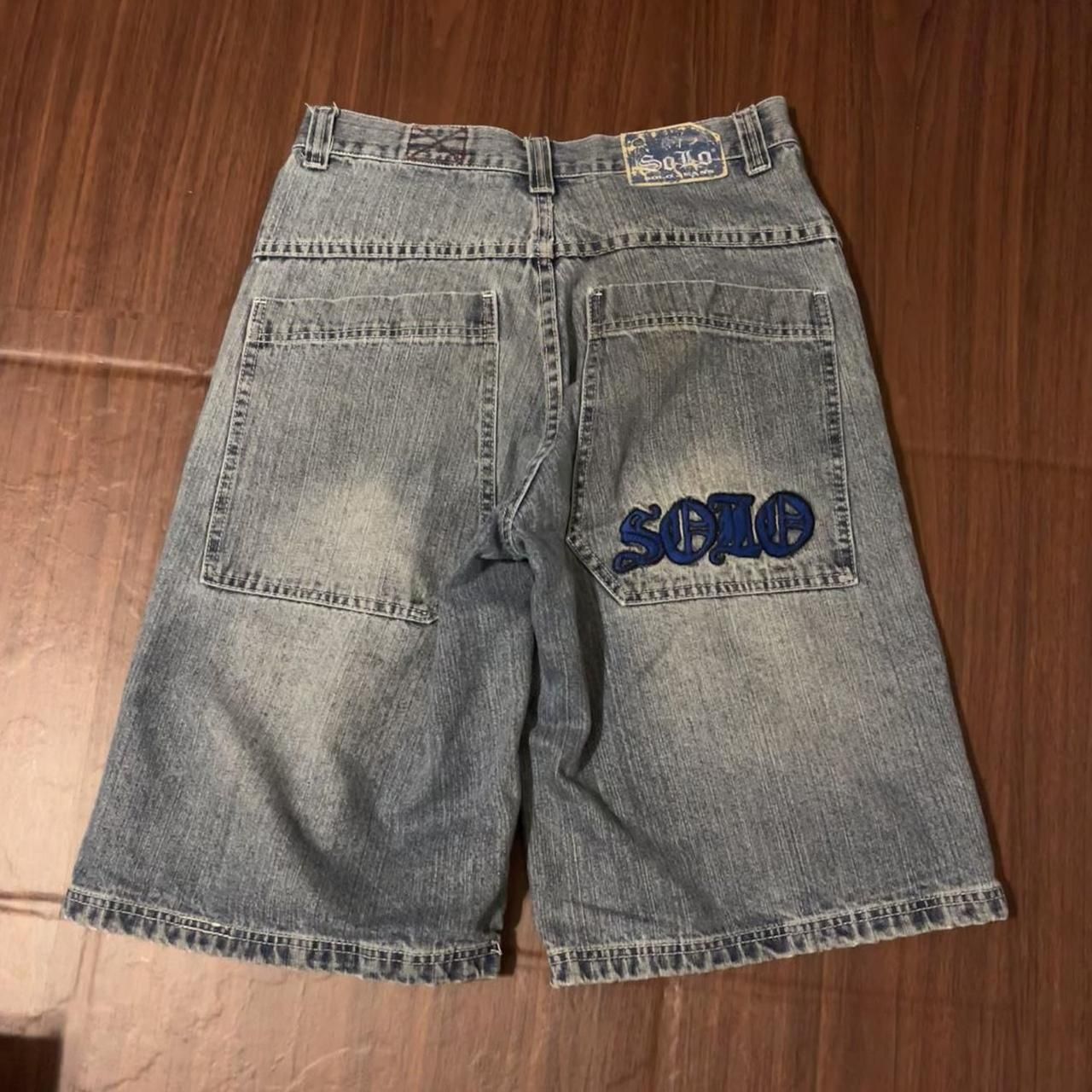 Baggy vintage Solo denim shorts with embroidered logo and flame design fashion Unfortunately missing the button