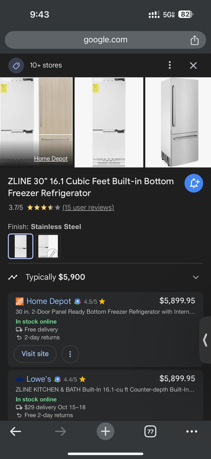 ZLINE 30" 16.1 Cubic Feet Built-in Bottom Freezer Refrigerator